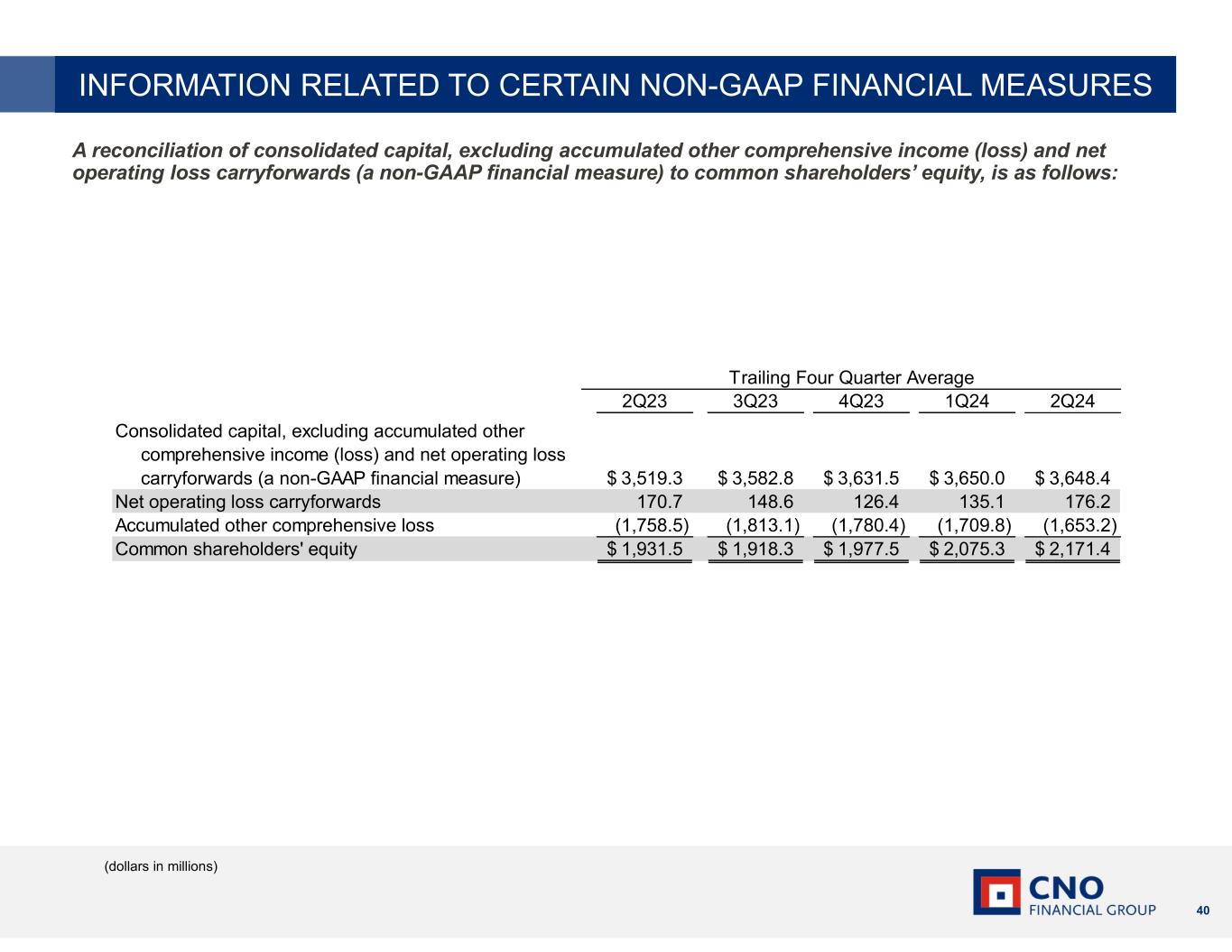 39 A reconciliation of consolidated capital, excluding accumulated other comprehensive income (loss) and net operating loss carryforwards (a non-GAAP financial measure) to common shareholders’ equity, is as follows: (dollars in millions) 1Q22 2Q22 3Q22 4Q22 Consolidated capital, excluding accumulated other comprehensive income (loss) and net operating loss carryforwards (a non-GAAP financial measure) 3,141.7$ 3,329.0$ 3,510.3$ 3,557.1$ Net operating loss carryforwards 238.2 214.7 190.9 169.0 Accumulated other comprehensive loss (561.5) (1,415.8) (1,837.8) (1,957.3) Common shareholders' equity 2,818.4$ 2,127.9$ 1,863.4$ 1,768.8$ 1Q23 2Q23 3Q23 4Q23 Consolidated capital, excluding accumulated other comprehensive income (loss) and net operating loss carryforwards (a non-GAAP financial measure) 3,543.8$ 3,603.0$ 3,744.2$ 3,712.8$ Net operating loss carryforwards 152.4 126.3 102.6 79.6 Accumulated other comprehensive loss (1,664.4) (1,733.5) (1,956.7) (1,576.8) Common shareholders' equity 2,031.8$ 1,995.8$ 1,890.1$ 2,215.6$ 1Q24 2Q24 Consolidated capital, excluding accumulated other comprehensive income (loss) and net operating loss carryforwards (a non-GAAP financial measure) 3,536.8$ 3,596.7$ Net operating loss carryforwards 311.2 296.5 Accumulated other comprehensive loss (1,480.3) (1,464.3) Common shareholders' equity 2,367.7$ 2,428.9$ INFORMATION RELATED TO CERTAIN NON-GAAP FINANCIAL MEASURES