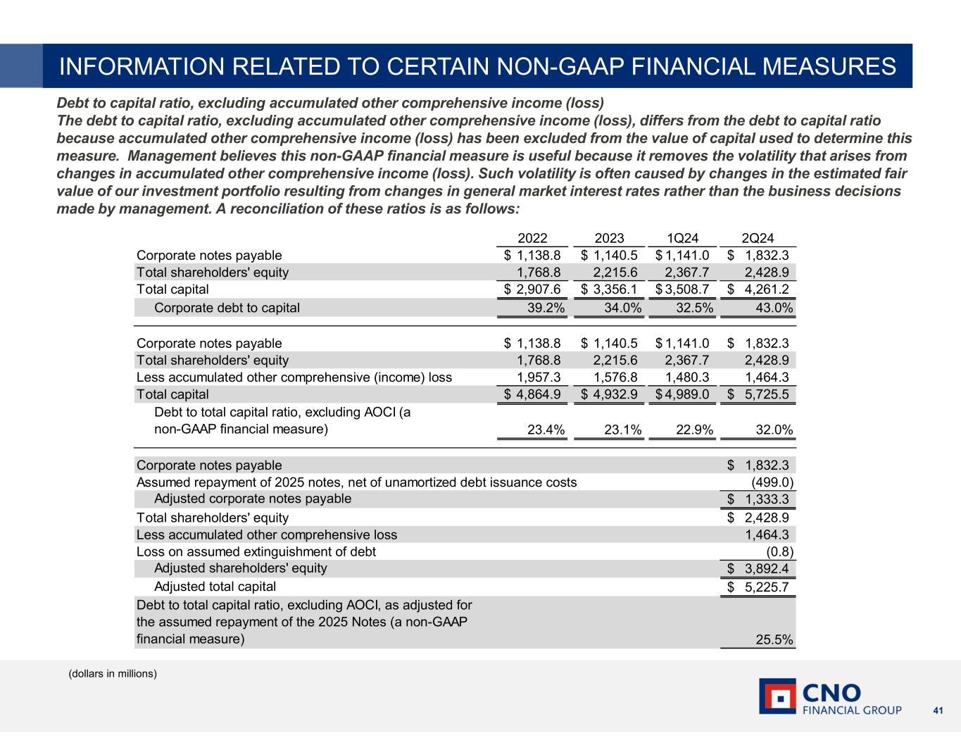 41 Debt to capital ratio, excluding accumulated other comprehensive income (loss) The debt to capital ratio, excluding accumulated other comprehensive income (loss), differs from the debt to capital ratio because accumulated other comprehensive income (loss) has been excluded from the value of capital used to determine this measure. Management believes this non-GAAP financial measure is useful because it removes the volatility that arises from changes in accumulated other comprehensive income (loss). Such volatility is often caused by changes in the estimated fair value of our investment portfolio resulting from changes in general market interest rates rather than the business decisions made by management. A reconciliation of these ratios is as follows: (dollars in millions) INFORMATION RELATED TO CERTAIN NON-GAAP FINANCIAL MEASURES 2022 2023 1Q24 2Q24 Corporate notes payable 1,138.8$ 1,140.5$ 1,141.0$ 1,832.3$ Total shareholders' equity 1,768.8 2,215.6 2,367.7 2,428.9 Total capital 2,907.6$ 3,356.1$ 3,508.7$ 4,261.2$ Corporate debt to capital 39.2% 34.0% 32.5% 43.0% Corporate notes payable 1,138.8$ 1,140.5$ 1,141.0$ 1,832.3$ Total shareholders' equity 1,768.8 2,215.6 2,367.7 2,428.9 Less accumulated other comprehensive (income) loss 1,957.3 1,576.8 1,480.3 1,464.3 Total capital 4,864.9$ 4,932.9$ 4,989.0$ 5,725.5$ Debt to total capital ratio, excluding AOCI (a non-GAAP financial measure) 23.4% 23.1% 22.9% 32.0% Corporate notes payable 1,832.3$ Assumed repayment of 2025 notes, net of unamortized debt issuance costs (499.0) Adjusted corporate notes payable 1,333.3$ Total shareholders' equity 2,428.9$ Less accumulated other comprehensive loss 1,464.3 Loss on assumed extinguishment of debt (0.8) Adjusted shareholders' equity 3,892.4$ Adjusted total capital 5,225.7$ Debt to total capital ratio, excluding AOCI, as adjusted for the assumed repayment of the 2025 Notes (a non-GAAP financial measure) 25.5%