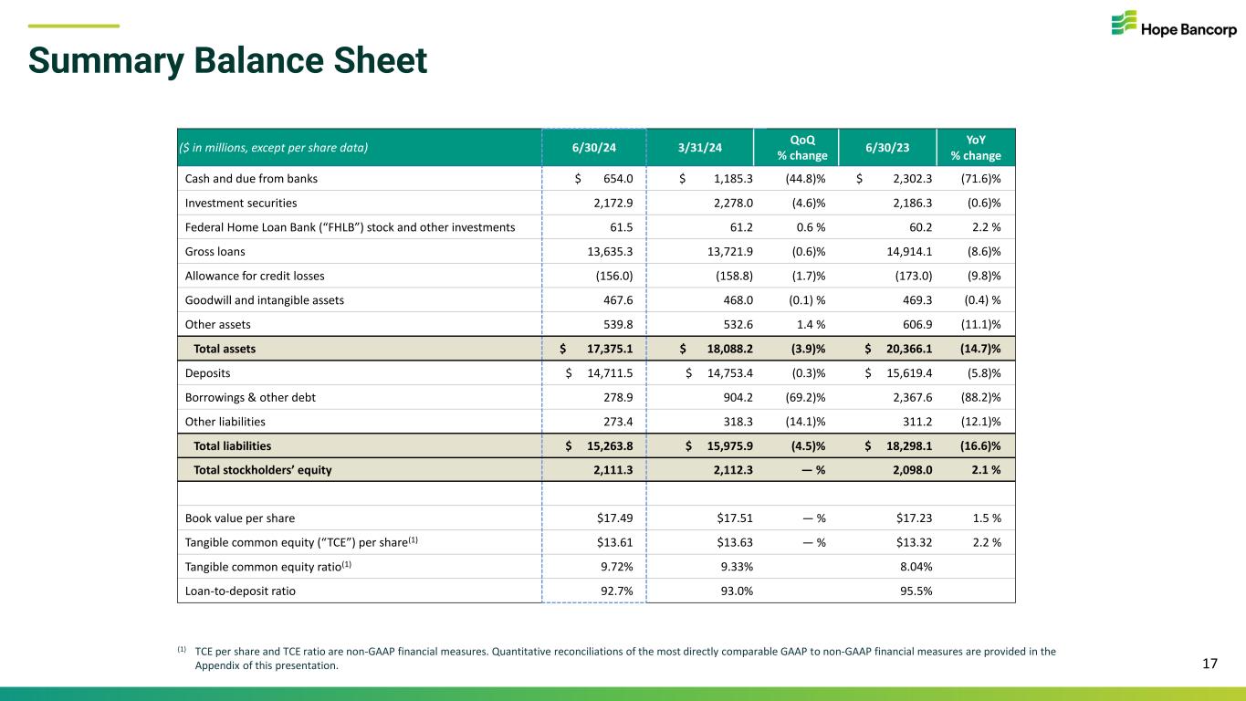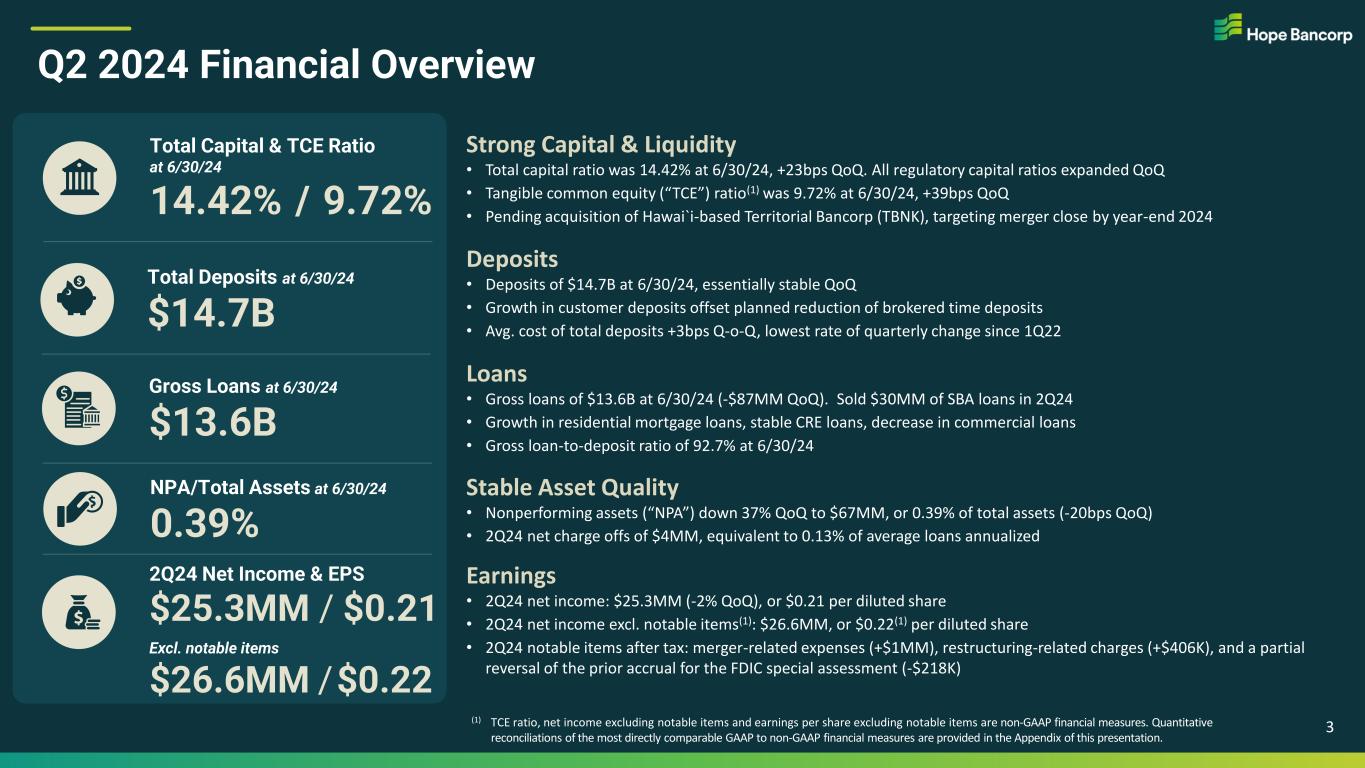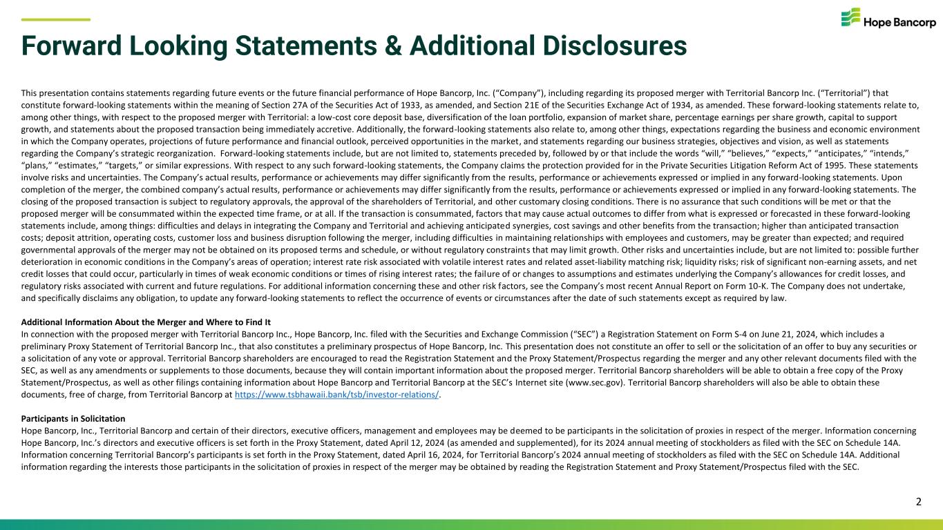 Forward Looking Statements & Additional Disclosures This presentation contains statements regarding future events or the future financial performance of Hope Bancorp, Inc. (“Company”), including regarding its proposed merger with Territorial Bancorp Inc. (“Territorial”) that constitute forward-looking statements within the meaning of Section 27A of the Securities Act of 1933, as amended, and Section 21E of the Securities Exchange Act of 1934, as amended. These forward-looking statements relate to, among other things, with respect to the proposed merger with Territorial: a low-cost core deposit base, diversification of the loan portfolio, expansion of market share, percentage earnings per share growth, capital to support growth, and statements about the proposed transaction being immediately accretive. Additionally, the forward-looking statements also relate to, among other things, expectations regarding the business and economic environment in which the Company operates, projections of future performance and financial outlook, perceived opportunities in the market, and statements regarding our business strategies, objectives and vision, as well as statements regarding the Company’s strategic reorganization. Forward-looking statements include, but are not limited to, statements preceded by, followed by or that include the words “will,” “believes,” “expects,” “anticipates,” “intends,” “plans,” “estimates,” “targets,” or similar expressions. With respect to any such forward-looking statements, the Company claims the protection provided for in the Private Securities Litigation Reform Act of 1995. These statements involve risks and uncertainties. The Company’s actual results, performance or achievements may differ significantly from the results, performance or achievements expressed or implied in any forward-looking statements. Upon completion of the merger, the combined company’s actual results, performance or achievements may differ significantly from the results, performance or achievements expressed or implied in any forward-looking statements. The closing of the proposed transaction is subject to regulatory approvals, the approval of the shareholders of Territorial, and other customary closing conditions. There is no assurance that such conditions will be met or that the proposed merger will be consummated within the expected time frame, or at all. If the transaction is consummated, factors that may cause actual outcomes to differ from what is expressed or forecasted in these forward-looking statements include, among things: difficulties and delays in integrating the Company and Territorial and achieving anticipated synergies, cost savings and other benefits from the transaction; higher than anticipated transaction costs; deposit attrition, operating costs, customer loss and business disruption following the merger, including difficulties in maintaining relationships with employees and customers, may be greater than expected; and required governmental approvals of the merger may not be obtained on its proposed terms and schedule, or without regulatory constraints that may limit growth. Other risks and uncertainties include, but are not limited to: possible further deterioration in economic conditions in the Company’s areas of operation; interest rate risk associated with volatile interest rates and related asset-liability matching risk; liquidity risks; risk of significant non-earning assets, and net credit losses that could occur, particularly in times of weak economic conditions or times of rising interest rates; the failure of or changes to assumptions and estimates underlying the Company’s allowances for credit losses, and regulatory risks associated with current and future regulations. For additional information concerning these and other risk factors, see the Company’s most recent Annual Report on Form 10-K. The Company does not undertake, and specifically disclaims any obligation, to update any forward-looking statements to reflect the occurrence of events or circumstances after the date of such statements except as required by law. Additional Information About the Merger and Where to Find It In connection with the proposed merger with Territorial Bancorp Inc., Hope Bancorp, Inc. filed with the Securities and Exchange Commission (“SEC”) a Registration Statement on Form S-4 on June 21, 2024, which includes a preliminary Proxy Statement of Territorial Bancorp Inc., that also constitutes a preliminary prospectus of Hope Bancorp, Inc. This presentation does not constitute an offer to sell or the solicitation of an offer to buy any securities or a solicitation of any vote or approval. Territorial Bancorp shareholders are encouraged to read the Registration Statement and the Proxy Statement/Prospectus regarding the merger and any other relevant documents filed with the SEC, as well as any amendments or supplements to those documents, because they will contain important information about the proposed merger. Territorial Bancorp shareholders will be able to obtain a free copy of the Proxy Statement/Prospectus, as well as other filings containing information about Hope Bancorp and Territorial Bancorp at the SEC’s Internet site (www.sec.gov). Territorial Bancorp shareholders will also be able to obtain these documents, free of charge, from Territorial Bancorp at https://www.tsbhawaii.bank/tsb/investor-relations/. Participants in Solicitation Hope Bancorp, Inc., Territorial Bancorp and certain of their directors, executive officers, management and employees may be deemed to be participants in the solicitation of proxies in respect of the merger. Information concerning Hope Bancorp, Inc.’s directors and executive officers is set forth in the Proxy Statement, dated April 12, 2024 (as amended and supplemented), for its 2024 annual meeting of stockholders as filed with the SEC on Schedule 14A. Information concerning Territorial Bancorp