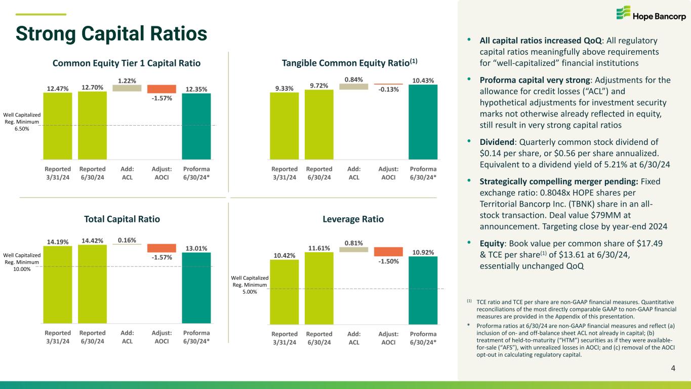 Strong Capital & Liquidity • Total capital ratio was 14.42% at 6/30/24, +23bps QoQ. All regulatory capital ratios expanded QoQ • Tangible common equity (“TCE”) ratio(1) was 9.72% at 6/30/24, +39bps QoQ • Pending acquisition of Hawai`i-based Territorial Bancorp (TBNK), targeting merger close by year-end 2024 Deposits • Deposits of $14.7B at 6/30/24, essentially stable QoQ • Growth in customer deposits offset planned reduction of brokered time deposits • Avg. cost of total deposits +3bps Q-o-Q, lowest rate of quarterly change since 1Q22 Loans • Gross loans of $13.6B at 6/30/24 (-$87MM QoQ). Sold $30MM of SBA loans in 2Q24 • Growth in residential mortgage loans, stable CRE loans, decrease in commercial loans • Gross loan-to-deposit ratio of 92.7% at 6/30/24 Stable Asset Quality • Nonperforming assets (“NPA”) down 37% QoQ to $67MM, or 0.39% of total assets (-20bps QoQ) • 2Q24 net charge offs of $4MM, equivalent to 0.13% of average loans annualized Earnings • 2Q24 net income: $25.3MM (-2% QoQ), or $0.21 per diluted share • 2Q24 net income excl. notable items(1): $26.6MM, or $0.22(1) per diluted share • 2Q24 notable items after tax: merger-related expenses (+$1MM), restructuring-related charges (+$406K), and a partial reversal of the prior accrual for the FDIC special assessment (-$218K) Q2 2024 Financial Overview Total Capital & TCE Ratio at 6/30/24 14.42% / 9.72% NPA/Total Assets at 6/30/24 0.39% Gross Loans at 6/30/24 $13.6B Total Deposits at 6/30/24 $14.7B 3 2Q24 Net Income & EPS $25.3MM / $0.21 Excl. notable items $26.6MM /$0.22 (1) TCE ratio, net income excluding notable items and earnings per share excluding notable items are non-GAAP financial measures. Quantitative reconciliations of the most directly comparable GAAP to non-GAAP financial measures are provided in the Appendix of this presentation.