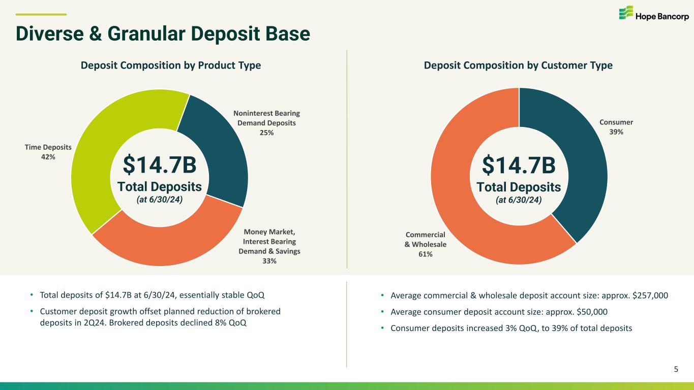 Strong Capital Ratios 4 Common Equity Tier 1 Capital Ratio • All capital ratios increased QoQ: All regulatory capital ratios meaningfully above requirements for “well-capitalized” financial institutions • Proforma capital very strong: Adjustments for the allowance for credit losses (“ACL”) and hypothetical adjustments for investment security marks not otherwise already reflected in equity, still result in very strong capital ratios • Dividend: Quarterly common stock dividend of $0.14 per share, or $0.56 per share annualized. Equivalent to a dividend yield of 5.21% at 6/30/24 • Strategically compelling merger pending: Fixed exchange ratio: 0.8048x HOPE shares per Territorial Bancorp Inc. (TBNK) share in an all- stock transaction. Deal value $79MM at announcement. Targeting close by year-end 2024 • Equity: Book value per common share of $17.49 & TCE per share(1) of $13.61 at 6/30/24, essentially unchanged QoQ Tangible Common Equity Ratio(1) Total Capital Ratio Leverage Ratio Well Capitalized Reg. Minimum 6.50% (1) TCE ratio and TCE per share are non-GAAP financial measures. Quantitative reconciliations of the most directly comparable GAAP to non-GAAP financial measures are provided in the Appendix of this presentation. * Proforma ratios at 6/30/24 are non-GAAP financial measures and reflect (a) inclusion of on- and off-balance sheet ACL not already in capital; (b) treatment of held-to-maturity (“HTM”) securities as if they were available- for-sale (“AFS”), with unrealized losses in AOCI; and (c) removal of the AOCI opt-out in calculating regulatory capital. Well Capitalized Reg. Minimum 10.00% Well Capitalized Reg. Minimum 5.00%