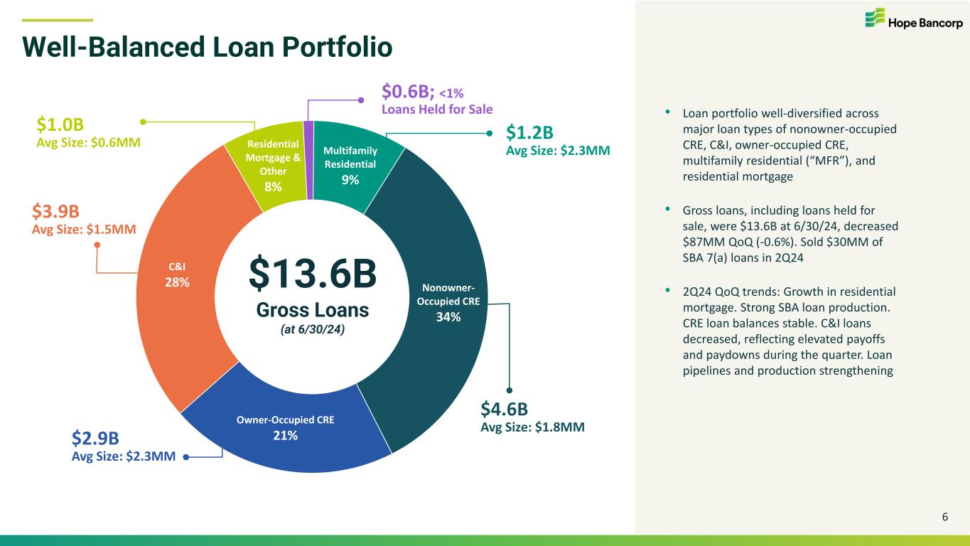 Diverse & Granular Deposit Base 5 Noninterest Bearing Demand Deposits 25% Money Market, Interest Bearing Demand & Savings 33% Time Deposits 42% $14.7B Total Deposits (at 6/30/24) Consumer 39% Commercial & Wholesale 61% • Average commercial & wholesale deposit account size: approx. $257,000 • Average consumer deposit account size: approx. $50,000 • Consumer deposits increased 3% QoQ, to 39% of total deposits • Total deposits of $14.7B at 6/30/24, essentially stable QoQ • Customer deposit growth offset planned reduction of brokered deposits in 2Q24. Brokered deposits declined 8% QoQ Deposit Composition by Product Type Deposit Composition by Customer Type $14.7B Total Deposits (at 6/30/24)