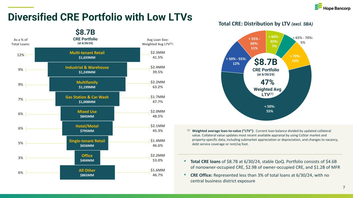 Well-Balanced Loan Portfolio 6 Nonowner- Occupied CRE 34% Owner-Occupied CRE 21% C&I 28% Residential Mortgage & Other 8% Multifamily Residential 9% $13.6B Gross Loans (at 6/30/24) $1.0B Avg Size: $0.6MM $4.6B Avg Size: $1.8MM $2.9B Avg Size: $2.3MM $3.9B Avg Size: $1.5MM $1.2B Avg Size: $2.3MM $0.6B; <1% Loans Held for Sale • Loan portfolio well-diversified across major loan types of nonowner-occupied CRE, C&I, owner-occupied CRE, multifamily residential (“MFR”), and residential mortgage • Gross loans, including loans held for sale, were $13.6B at 6/30/24, decreased $87MM QoQ (-0.6%). Sold $30MM of SBA 7(a) loans in 2Q24 • 2Q24 QoQ trends: Growth in residential mortgage. Strong SBA loan production. CRE loan balances stable. C&I loans decreased, reflecting elevated payoffs and paydowns during the quarter. Loan pipelines and production strengthening