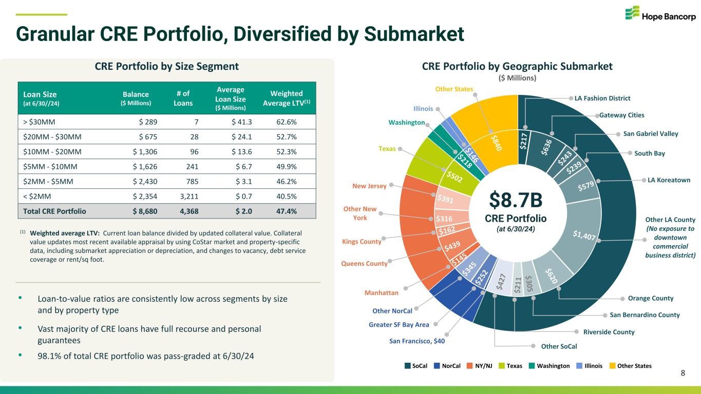 As a % of Total Loans: Avg Loan Size: Weighted Avg LTV(1): 12% Multi-tenant Retail $1,659MM $2.3MM 41.5% 9% Industrial & Warehouse $1,249MM $2.4MM 39.5% 9% Multifamily $1,199MM $2.2MM 63.2% 7% Gas Station & Car Wash $1,008MM $1.7MM 47.7% 6% Mixed Use $845MM $2.0MM 48.5% 6% Hotel/Motel $795MM $2.1MM 45.3% 5% Single-tenant Retail $656MM $1.4MM 46.6% 3% Office $404MM $2.2MM 53.0% 6% All Other $865MM $1.6MM 46.7% Diversified CRE Portfolio with Low LTVs Total CRE: Distribution by LTV (excl. SBA) < 50%: 55% > 50% - 55%: 12% > 55% - 60%: 11% > 60% - 65%: 7% > 65% - 70%: 5% > 70%: 10%$8.7B CRE Portfolio (at 6/30/24) 47% Weighted Avg LTV(1) (1) Weighted average loan-to-value (“LTV”): Current loan balance divided by updated collateral value. Collateral value updates most recent available appraisal by using CoStar market and property-specific data, including submarket appreciation or depreciation, and changes to vacancy, debt service coverage or rent/sq foot. • Total CRE loans of $8.7B at 6/30/24, stable QoQ. Portfolio consists of $4.6B of nonowner-occupied CRE, $2.9B of owner-occupied CRE, and $1.2B of MFR • CRE Office: Represented less than 3% of total loans at 6/30/24, with no central business district exposure 7 $8.7B CRE Portfolio (at 6/30/24)