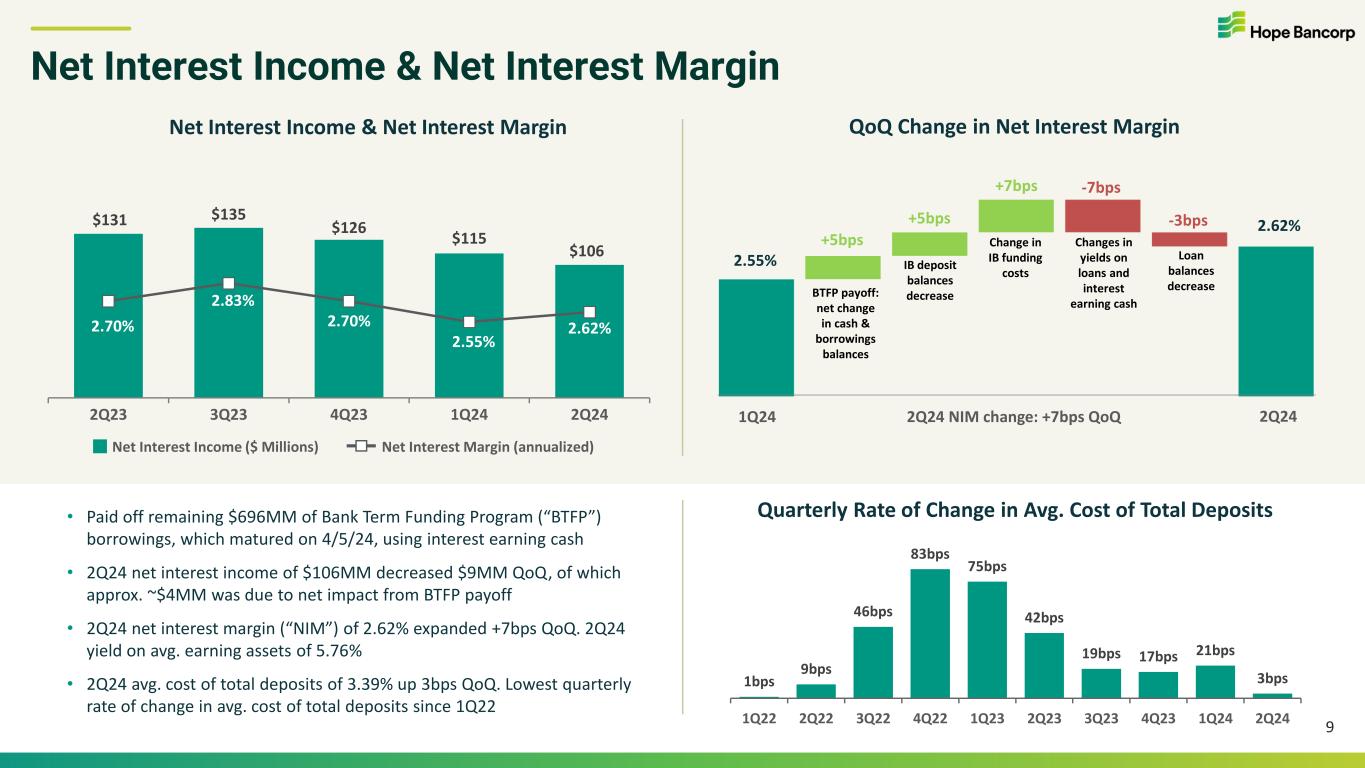 “Quarter-over-quarter, total deposits were essentially stable with growth in noninterest bearing demand deposits and other customer deposits largely offsetting a planned reduction in brokered time deposits. Our cost of total deposits increased by only three basis points this quarter, a sharp deceleration from the quarterly increases over the past two years. Gross loans decreased modestly quarter-over-quarter as elevated payoffs and paydowns offset growing production volumes. Given the improved conditions in the secondary markets, we resumed SBA loan sales during the second quarter. Nonperforming assets of $67.3 million at June 30, 2024, decreased 37% from March 31, 2024, and our overall credit quality remains stable.