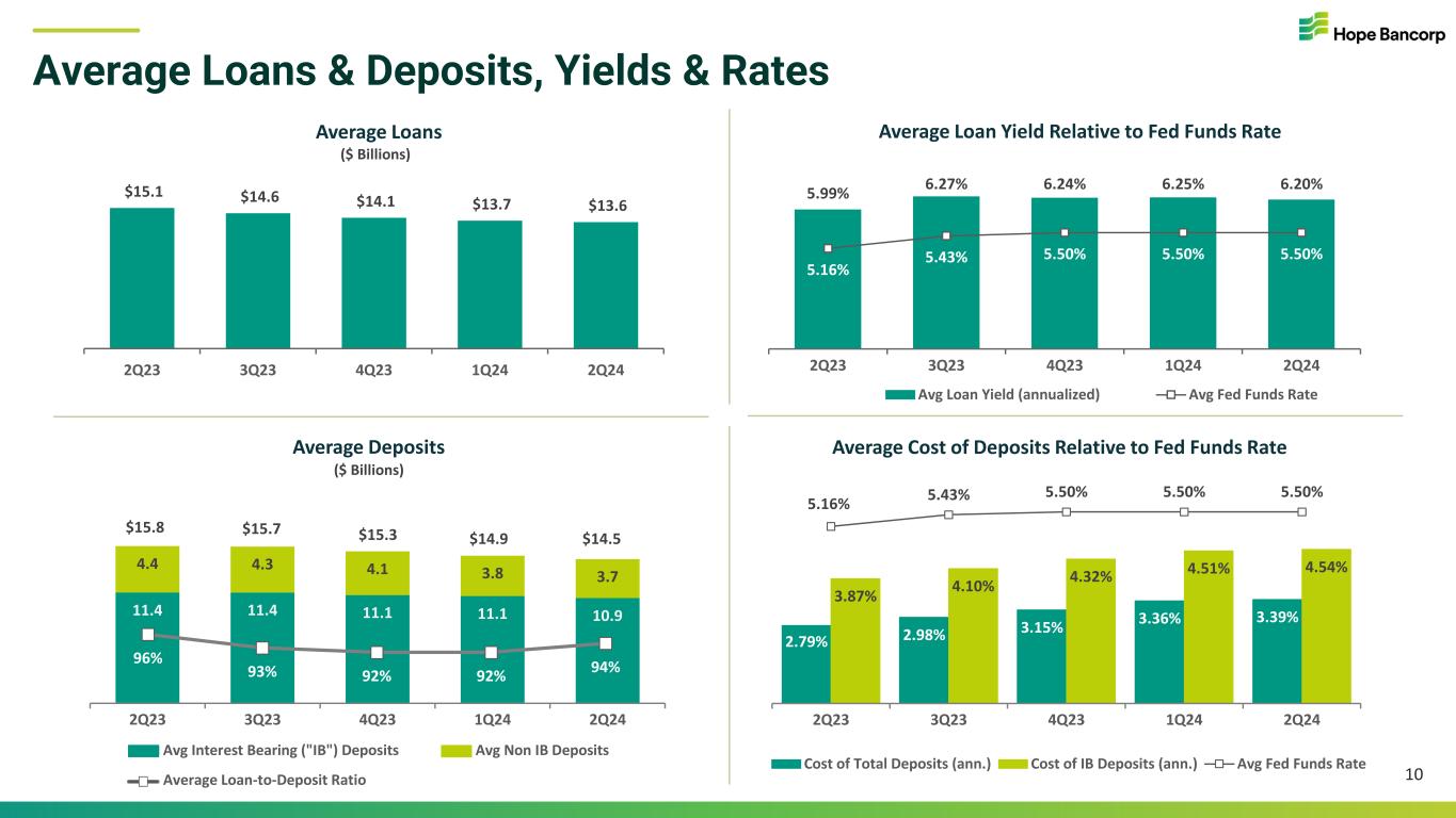 Net Interest Income & Net Interest Margin 9 Net Interest Income & Net Interest Margin $131 $135 $126 $115 $106 2.70% 2.83% 2.70% 2.55% 2.62% 2Q23 3Q23 4Q23 1Q24 2Q24 2.62% 2.55% IB deposit balances decrease +5bps 2Q24 NIM change: +7bps QoQ Net Interest Income Net Interest Margin (annualized) QoQ Change in Net Interest Margin 1Q24 2Q24 -3bps Change in IB funding costs BTFP payoff: net change in cash & borrowings balances +5bps Loan balances decrease +7bps Changes in yields on loans and interest earning cash -7bps • Paid off remaining $696MM of Bank Term Funding Program (“BTFP”) borrowings, which matured on 4/5/24, using interest earning cash • 2Q24 net interest income of $106MM decreased $9MM QoQ, of which approx. ~$4MM was due to net impact from BTFP payoff • 2Q24 net interest margin (“NIM”) of 2.62% expanded +7bps QoQ. 2Q24 yield on avg. earning assets of 5.76% • 2Q24 avg. cost of total deposits of 3.39% up 3bps QoQ. Lowest quarterly rate of change in avg. cost of total deposits since 1Q22 Quarterly Rate of Change in Avg. Cost of Total Deposits 1bps 9bps 46bps 83bps 75bps 42bps 19bps 17bps 21bps 3bps 0 10 20 30 40 50 60 70 80 90 1Q22 2Q22 3Q22 4Q22 1Q23 2Q23 3Q23 4Q23 1Q24 2Q24 ($ Millions)