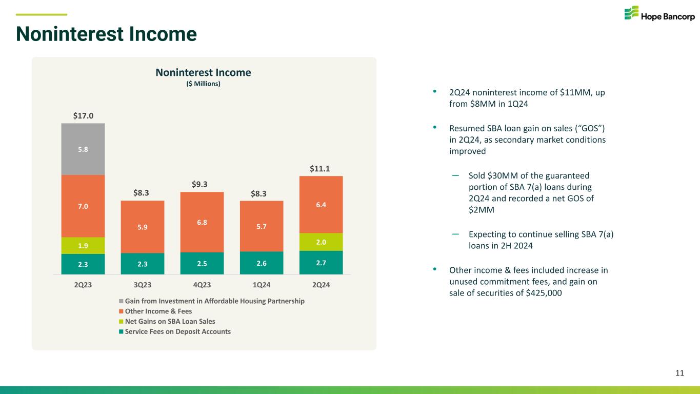 2.79% 2.98% 3.15% 3.36% 3.39% 3.87% 4.10% 4.32% 4.51% 4.54% 5.16% 5.43% 5.50% 5.50% 5.50% 2Q23 3Q23 4Q23 1Q24 2Q24 Cost of Total Deposits (ann.) Cost of IB Deposits (ann.) Avg Fed Funds Rate Average Loans & Deposits, Yields & Rates 10 Average Deposits Average Loans ($ Billions) ($ Billions) $15.1 $14.6 $14.1 $13.7 $13.6 0.00 2.00 4.00 6.00 8.00 10.00 12.00 14.00 16.00 2Q23 3Q23 4Q23 1Q24 2Q24 11.4 11.4 11.1 11.1 10.9 4.4 4.3 4.1 3.8 3.7 2Q23 3Q23 4Q23 1Q24 2Q24 Avg Interest Bearing ("IB") Deposits Avg Non IB Deposits 5.99% 6.27% 6.24% 6.25% 6.20% 5.16% 5.43% 5.50% 5.50% 5.50% 2Q23 3Q23 4Q23 1Q24 2Q24 Avg Loan Yield (annualized) Avg Fed Funds Rate Average Loan-to-Deposit Ratio 96% 93% 92% 92% 94% Average Cost of Deposits Relative to Fed Funds Rate Average Loan Yield Relative to Fed Funds Rate $14.5$14.9$15.3$15.7$15.8
