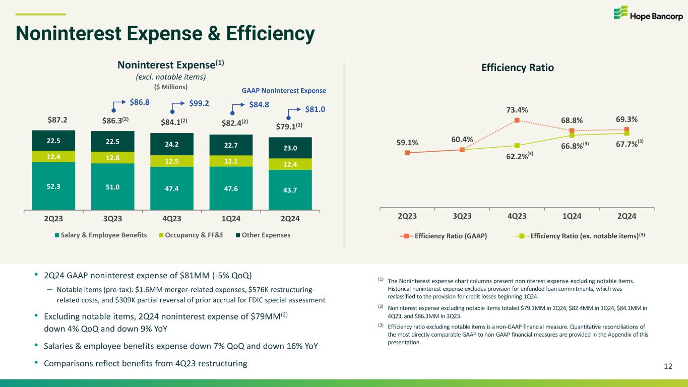 2.3 2.3 2.5 2.6 2.7 1.9 2.0 7.0 5.9 6.8 5.7 6.4 5.8 2Q23 3Q23 4Q23 1Q24 2Q24 Gain from Investment in Affordable Housing Partnership Other Income & Fees Net Gains on SBA Loan Sales Service Fees on Deposit Accounts Noninterest Income 11 Noninterest Income ($ Millions) $17.0 $8.3 $9.3 $8.3 $11.1 • 2Q24 noninterest income of $11MM, up from $8MM in 1Q24 • Resumed SBA loan gain on sales (“GOS”) in 2Q24, as secondary market conditions improved – Sold $30MM of the guaranteed portion of SBA 7(a) loans during 2Q24 and recorded a net GOS of $2MM – Expecting to continue selling SBA 7(a) loans in 2H 2024 • Other income & fees included increase in unused commitment fees, and gain on sale of securities of $425,000