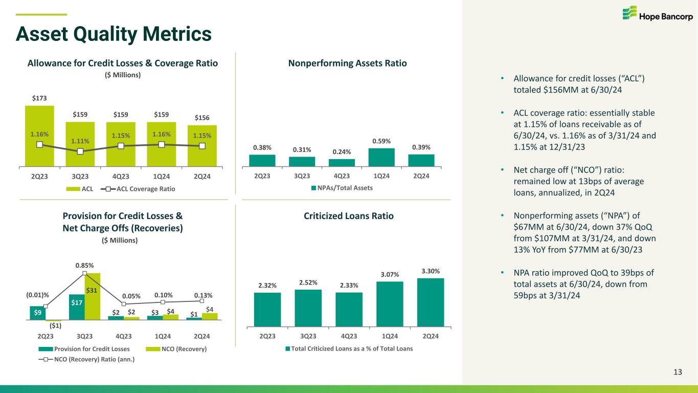 59.1% 60.4% 73.4% 68.8% 69.3% 62.2% 66.8% 67.7% 2Q23 3Q23 4Q23 1Q24 2Q24 Efficiency Ratio (GAAP) Efficiency Ratio (ex. notable items) 52.3 51.0 47.4 47.6 43.7 12.4 12.8 12.5 12.1 12.4 22.5 22.5 24.2 22.7 23.0 2Q23 3Q23 4Q23 1Q24 2Q24 Salary & Employee Benefits Occupancy & FF&E Other Expenses Efficiency Ratio Noninterest Expense & Efficiency 12 $87.2 $86.3(2) $84.1(2) $82.4(2) $79.1(2) Noninterest Expense(1) (excl. notable items) ($ Millions) • 2Q24 GAAP noninterest expense of $81MM (-5% QoQ) – Notable items (pre-tax): $1.6MM merger-related expenses, $576K restructuring- related costs, and $309K partial reversal of prior accrual for FDIC special assessment • Excluding notable items, 2Q24 noninterest expense of $79MM(2) down 4% QoQ and down 9% YoY • Salaries & employee benefits expense down 7% QoQ and down 16% YoY • Comparisons reflect benefits from 4Q23 restructuring (1) The Noninterest expense chart columns present noninterest expense excluding notable items. Historical noninterest expense excludes provision for unfunded loan commitments, which was reclassified to the provision for credit losses beginning 1Q24. (2) Noninterest expense excluding notable items totaled $79.1MM in 2Q24, $82.4MM in 1Q24, $84.1MM in 4Q23, and $86.3MM in 3Q23. (3) Efficiency ratio excluding notable items is a non-GAAP financial measure. Quantitative reconciliations of the most directly comparable GAAP to non-GAAP financial measures are provided in the Appendix of this presentation. GAAP Noninterest Expense $86.8 $99.2 $84.8 $81.0 (3) (3)(3) (3)