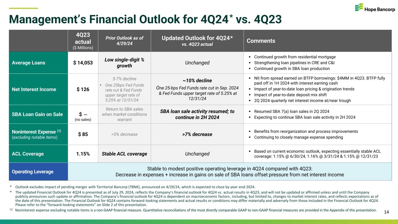 $173 $159 $159 $159 $156 1.16% 1.11% 1.15% 1.16% 1.15% 2Q23 3Q23 4Q23 1Q24 2Q24 ACL ACL Coverage Ratio • Allowance for credit losses (“ACL”) totaled $156MM at 6/30/24 • ACL coverage ratio: essentially stable at 1.15% of loans receivable as of 6/30/24, vs. 1.16% as of 3/31/24 and 1.15% at 12/31/23 • Net charge off (“NCO”) ratio: remained low at 13bps of average loans, annualized, in 2Q24 • Nonperforming assets (“NPA”) of $67MM at 6/30/24, down 37% QoQ from $107MM at 3/31/24, and down 13% YoY from $77MM at 6/30/23 • NPA ratio improved QoQ to 39bps of total assets at 6/30/24, down from 59bps at 3/31/24 Asset Quality Metrics 13 Provision for Credit Losses & Net Charge Offs (Recoveries) Nonperforming Assets RatioAllowance for Credit Losses & Coverage Ratio Criticized Loans Ratio $9 $17 $2 $3 $1 ($1) $31 $2 $4 $4 (0.01)% 0.85% 0.05% 0.10% 0.13% 2Q23 3Q23 4Q23 1Q24 2Q24 Provision for Credit Losses NCO (Recovery) NCO (Recovery) Ratio (ann.) 2.32% 2.52% 2.33% 3.07% 3.30% 2Q23 3Q23 4Q23 1Q24 2Q24 Total Criticized Loans as a % of Total Loans ($ Millions) ($ Millions) 0.38% 0.31% 0.24% 0.59% 0.39% 2Q23 3Q23 4Q23 1Q24 2Q24 NPAs/Total Assets