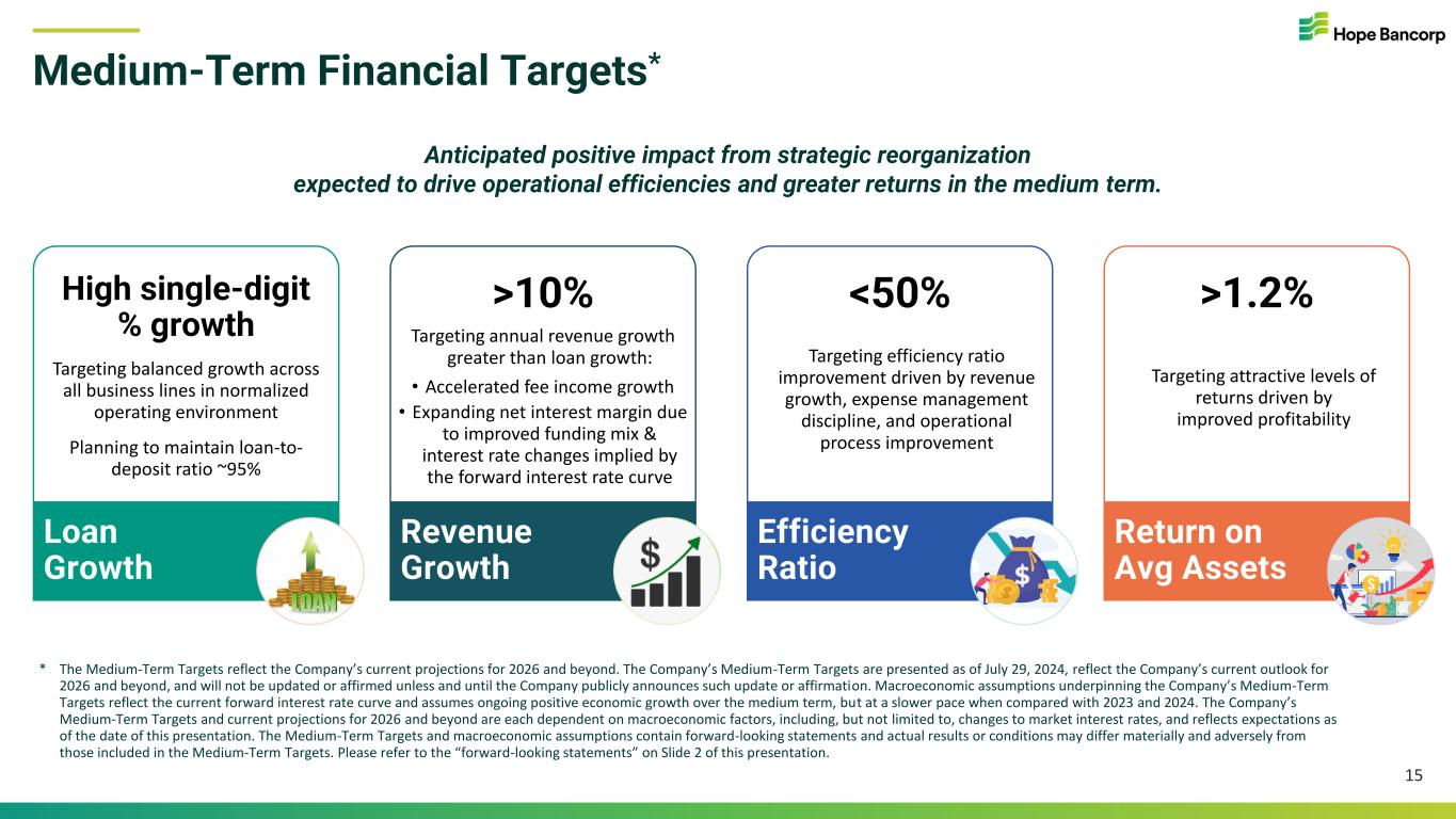 Management’s Financial Outlook for 4Q24* vs. 4Q23 14 4Q23 actual ($ Millions) Prior Outlook as of 4/29/24 Updated Outlook for 4Q24* vs. 4Q23 actual Comments Average Loans $ 14,053 Low single-digit % growth Unchanged ▪ Continued growth from residential mortgage ▪ Strengthening loan pipelines in CRE and C&I ▪ Continued growth in SBA loan production Net Interest Income $ 126 5-7% decline ▪ One 25bps Fed Funds rate cut & Fed Funds upper target rate of 5.25% at 12/31/24 ~10% decline One 25-bps Fed Funds rate cut in Sep. 2024 & Fed Funds upper target rate of 5.25% at 12/31/24 ▪ NII from spread earned on BTFP borrowings: $4MM in 4Q23. BTFP fully paid off in 1H 2024 with interest earning cash ▪ Impact of year-to-date loan pricing & origination trends ▪ Impact of year-to-date deposit mix shift ▪ 2Q 2024 quarterly net interest income at/near trough SBA Loan Gain on Sale $ ̶ (no sales) Return to SBA sales when market conditions warrant SBA loan sale activity resumed; to continue in 2H 2024 ▪ Resumed SBA 7(a) loan sales in 2Q 2024 ▪ Expecting to continue SBA loan sale activity in 2H 2024 Noninterest Expense (1) (excluding notable items) $ 85 >5% decrease >7% decrease ▪ Benefits from reorganization and process improvements ▪ Continuing to closely manage expense spending ACL Coverage 1.15% Stable ACL coverage Unchanged ▪ Based on current economic outlook, expecting essentially stable ACL coverage: 1.15% @ 6/30/24, 1.16% @ 3/31/24 & 1.15% @ 12/31/23 Operating Leverage Stable to modest positive operating leverage in 4Q24 compared with 4Q23: Decrease in expenses + increase in gains on sale of SBA loans offset pressure from net interest income * Outlook excludes impact of pending merger with Territorial Bancorp (TBNK), announced on 4/29/24, which is expected to close by year-end 2024. * The updated Financial Outlook for 4Q24 is presented as of July 29, 2024, reflects the Company’s financial outlook for 4Q24 vs. actual results in 4Q23, and will not be updated or affirmed unless and until the Company publicly announces such update or affirmation. The Company’s financial outlook for 4Q24 is dependent on macroeconomic factors, including, but limited to, changes to market interest rates, and reflects expectations as of the date of this presentation. The Financial Outlook for 4Q24 contains forward-looking statements and actual results or conditions may differ materially and adversely from those included in the Financial Outlook for 4Q24. Please refer to the “forward-looking statements” on Slide 2 of this presentation. (1) Noninterest expense excluding notable items is a non-GAAP financial measure. Quantitative reconciliations of the most directly comparable GAAP to non-GAAP financial measures are provided in the Appendix of this presentation.