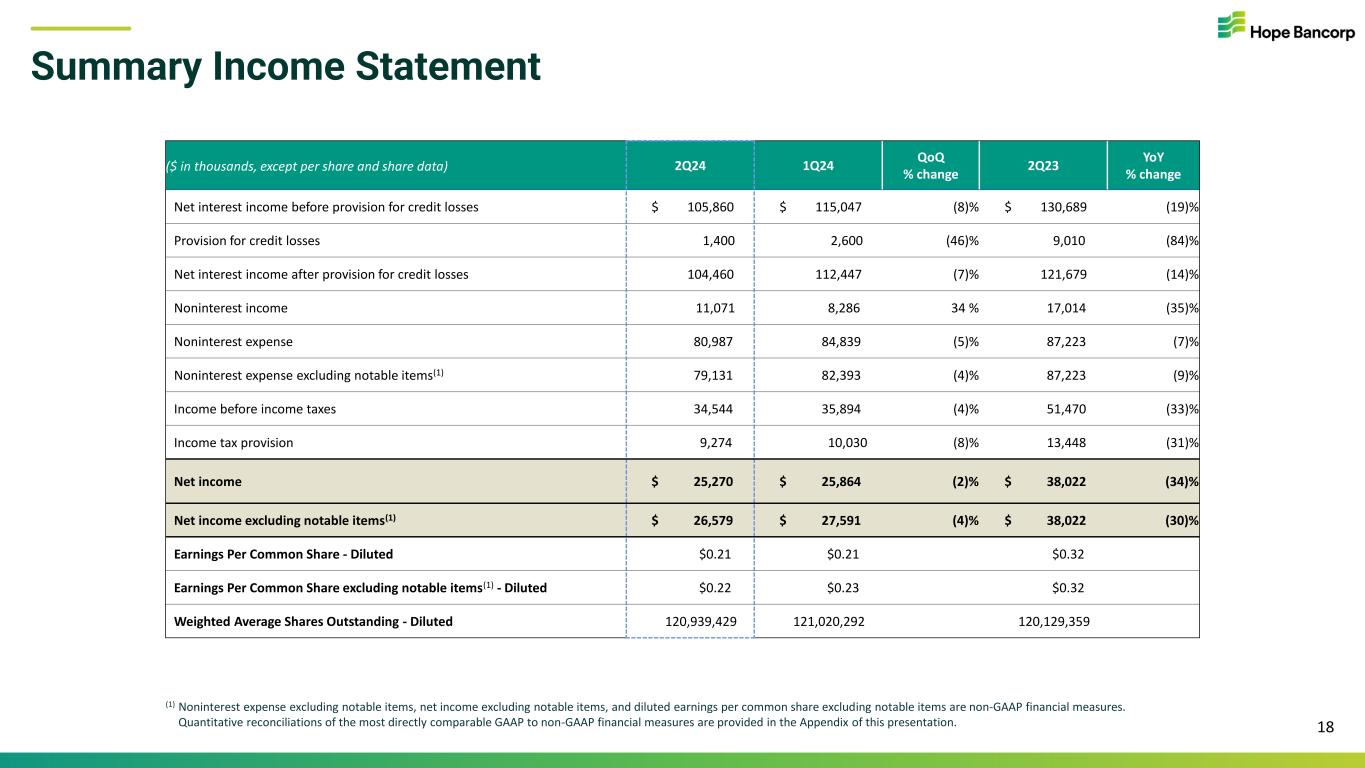 Summary Balance Sheet 17 ($ in millions, except per share data) 6/30/24 3/31/24 QoQ % change 6/30/23 YoY % change Cash and due from banks $ 654.0 $ 1,185.3 (44.8)% $ 2,302.3 (71.6)% Investment securities 2,172.9 2,278.0 (4.6)% 2,186.3 (0.6)% Federal Home Loan Bank (“FHLB”) stock and other investments 61.5 61.2 0.6 % 60.2 2.2 % Gross loans 13,635.3 13,721.9 (0.6)% 14,914.1 (8.6)% Allowance for credit losses (156.0) (158.8) (1.7)% (173.0) (9.8)% Goodwill and intangible assets 467.6 468.0 (0.1) % 469.3 (0.4) % Other assets 539.8 532.6 1.4 % 606.9 (11.1)% Total assets $ 17,375.1 $ 18,088.2 (3.9)% $ 20,366.1 (14.7)% Deposits $ 14,711.5 $ 14,753.4 (0.3)% $ 15,619.4 (5.8)% Borrowings & other debt 278.9 904.2 (69.2)% 2,367.6 (88.2)% Other liabilities 273.4 318.3 (14.1)% 311.2 (12.1)% Total liabilities $ 15,263.8 $ 15,975.9 (4.5)% $ 18,298.1 (16.6)% Total stockholders’ equity 2,111.3 2,112.3 — % 2,098.0 2.1 % Book value per share $17.49 $17.51 — % $17.23 1.5 % Tangible common equity (“TCE”) per share(1) $13.61 $13.63 — % $13.32 2.2 % Tangible common equity ratio(1) 9.72% 9.33% 8.04% Loan-to-deposit ratio 92.7% 93.0% 95.5% (1) TCE per share and TCE ratio are non-GAAP financial measures. Quantitative reconciliations of the most directly comparable GAAP to non-GAAP financial measures are provided in the Appendix of this presentation.