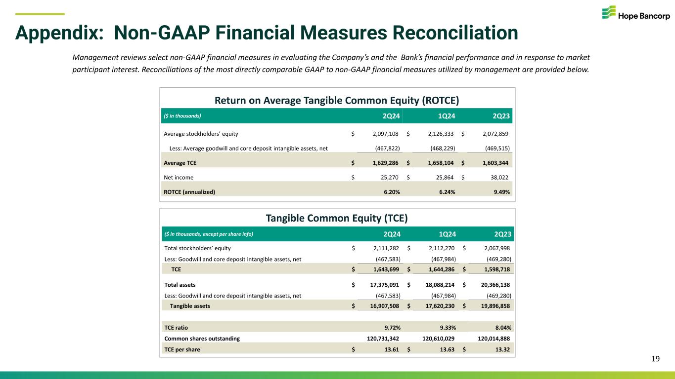 Summary Income Statement 18 ($ in thousands, except per share and share data) 2Q24 1Q24 QoQ % change 2Q23 YoY % change Net interest income before provision for credit losses $ 105,860 $ 115,047 (8)% $ 130,689 (19)% Provision for credit losses 1,400 2,600 (46)% 9,010 (84)% Net interest income after provision for credit losses 104,460 112,447 (7)% 121,679 (14)% Noninterest income 11,071 8,286 34 % 17,014 (35)% Noninterest expense 80,987 84,839 (5)% 87,223 (7)% Noninterest expense excluding notable items(1) 79,131 82,393 (4)% 87,223 (9)% Income before income taxes 34,544 35,894 (4)% 51,470 (33)% Income tax provision 9,274 10,030 (8)% 13,448 (31)% Net income $ 25,270 $ 25,864 (2)% $ 38,022 (34)% Net income excluding notable items(1) $ 26,579 $ 27,591 (4)% $ 38,022 (30)% Earnings Per Common Share - Diluted $0.21 $0.21 $0.32 Earnings Per Common Share excluding notable items(1) - Diluted $0.22 $0.23 $0.32 Weighted Average Shares Outstanding - Diluted 120,939,429 121,020,292 120,129,359 (1) Noninterest expense excluding notable items, net income excluding notable items, and diluted earnings per common share excluding notable items are non-GAAP financial measures. Quantitative reconciliations of the most directly comparable GAAP to non-GAAP financial measures are provided in the Appendix of this presentation.