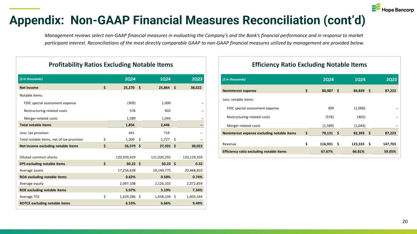 Appendix: Non-GAAP Financial Measures Reconciliation Management reviews select non-GAAP financial measures in evaluating the Company’s and the Bank’s financial performance and in response to market participant interest. Reconciliations of the most directly comparable GAAP to non-GAAP financial measures utilized by management are provided below. Tangible Common Equity (TCE) 19 Return on Average Tangible Common Equity (ROTCE) ($ in thousands, except per share info) 2Q24 1Q24 2Q23 Total stockholders’ equity $ 2,111,282 $ 2,112,270 $ 2,067,998 Less: Goodwill and core deposit intangible assets, net (467,583) (467,984) (469,280) TCE $ 1,643,699 $ 1,644,286 $ 1,598,718 Total assets $ 17,375,091 $ 18,088,214 $ 20,366,138 Less: Goodwill and core deposit intangible assets, net (467,583) (467,984) (469,280) Tangible assets $ 16,907,508 $ 17,620,230 $ 19,896,858 TCE ratio 9.72% 9.33% 8.04% Common shares outstanding 120,731,342 120,610,029 120,014,888 TCE per share $ 13.61 $ 13.63 $ 13.32 ($ in thousands) 2Q24 1Q24 2Q23 Average stockholders’ equity $ 2,097,108 $ 2,126,333 $ 2,072,859 Less: Average goodwill and core deposit intangible assets, net (467,822) (468,229) (469,515) Average TCE $ 1,629,286 $ 1,658,104 $ 1,603,344 Net income $ 25,270 $ 25,864 $ 38,022 ROTCE (annualized) 6.20% 6.24% 9.49%