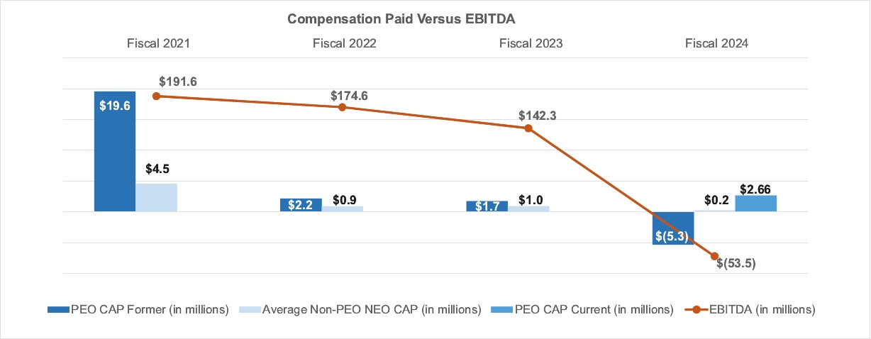 | | Fiscal Year | | | Summary Compensation Table Total for PEO ($)(1) | | | Compensation Actually Paid to PEO ($)(2) | | | Summary Compensation Table Total for Former PEO ($)(1) | | | Compensation Actually Paid to Former PEO ($)(2) | | | Average Summary Compensation Table Total for Non-PEO NEOs ($)(3) | | | Average Compensation Actually Paid to Non-PEO NEOs ($)(2) | | | Value of Initial Fixed $100 Investment Based On: | | | Net Income ($ In Millions)(6) | | | EBITDA ($ In Millions)(7) | | |||