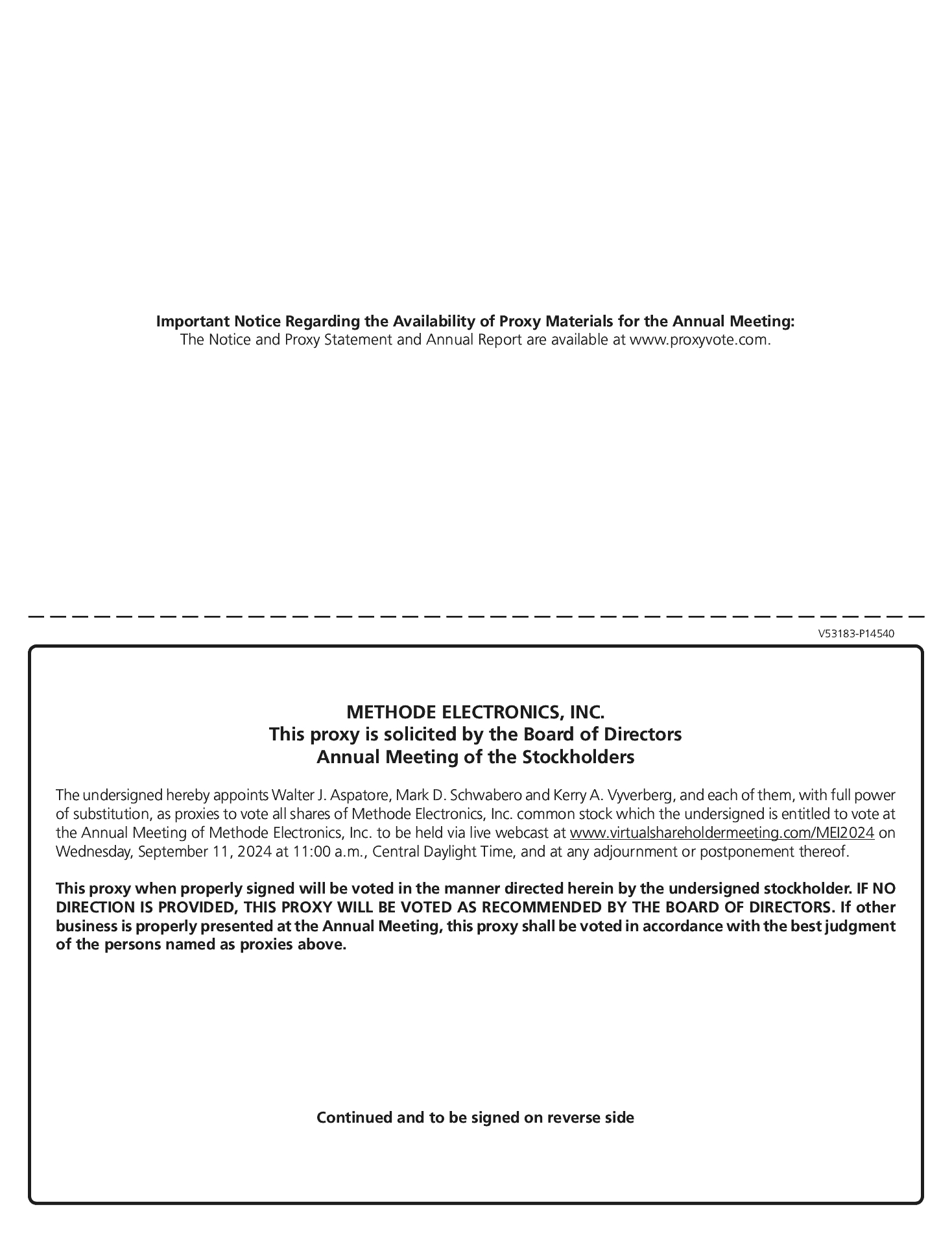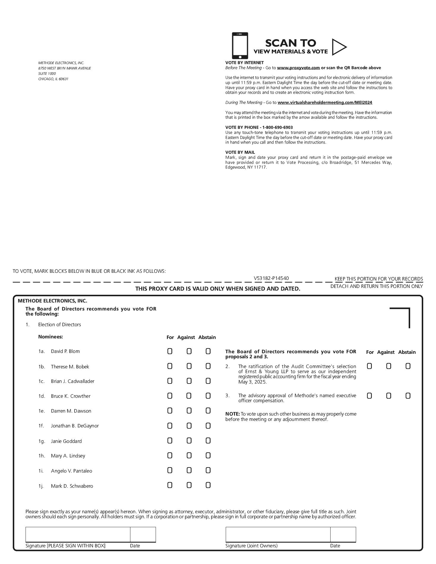 3. | To approve, on a non-binding, advisory basis, the compensation of Methode’s named executive officers; and |