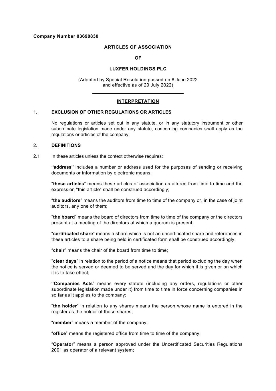 Company Number 03690830 ARTICLES OF ASSOCIATION OF LUXFER HOLDINGS PLC (Adopted by Special Resolution passed on 8 June 2022 and effective as of 29 July 2022) INTERPRETATION 1. EXCLUSION OF OTHER REGULATIONS OR ARTICLES No regulations or articles set out in any statute, or in any statutory instrument or other subordinate legislation made under any statute, concerning companies shall apply as the regulations or articles of the company. 2. DEFINITIONS 2.1 In these articles unless the context otherwise requires: “address” includes a number or address used for the purposes of sending or receiving documents or information by electronic means; “these articles” means these articles of association as altered from time to time and the expression "this article" shall be construed accordingly; “the auditors” means the auditors from time to time of the company or, in the case of joint auditors, any one of them; “the board” means the board of directors from time to time of the company or the directors present at a meeting of the directors at which a quorum is present; “certificated share” means a share which is not an uncertificated share and references in these articles to a share being held in certificated form shall be construed accordingly; “chair” means the chair of the board from time to time; “clear days” in relation to the period of a notice means that period excluding the day when the notice is served or deemed to be served and the day for which it is given or on which it is to take effect; “Companies Acts” means every statute (including any orders, regulations or other subordinate legislation made under it) from time to time in force concerning companies in so far as it applies to the company; “the holder” in relation to any shares means the person whose name is entered in the register as the holder of those shares; “member” means a member of the company; “office” means the registered office from time to time of the company; “Operator” means a person approved under the Uncertificated Securities Regulations 2001 as operator of a relevant system;