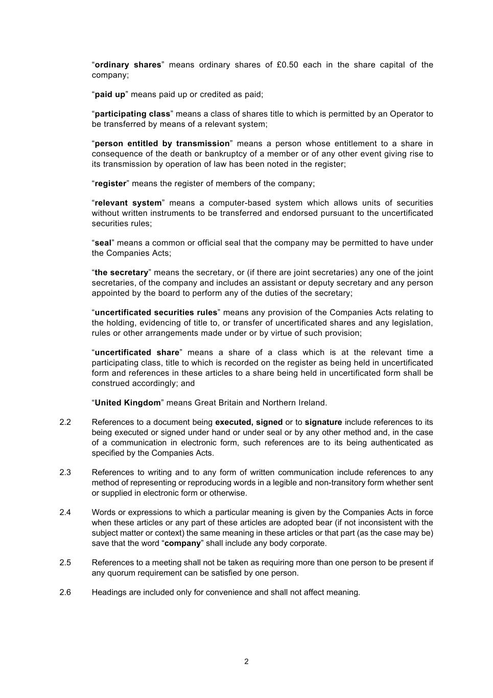2 “ordinary shares” means ordinary shares of £0.50 each in the share capital of the company; “paid up” means paid up or credited as paid; “participating class” means a class of shares title to which is permitted by an Operator to be transferred by means of a relevant system; “person entitled by transmission” means a person whose entitlement to a share in consequence of the death or bankruptcy of a member or of any other event giving rise to its transmission by operation of law has been noted in the register; “register” means the register of members of the company; “relevant system” means a computer-based system which allows units of securities without written instruments to be transferred and endorsed pursuant to the uncertificated securities rules; “seal” means a common or official seal that the company may be permitted to have under the Companies Acts; “the secretary” means the secretary, or (if there are joint secretaries) any one of the joint secretaries, of the company and includes an assistant or deputy secretary and any person appointed by the board to perform any of the duties of the secretary; “uncertificated securities rules” means any provision of the Companies Acts relating to the holding, evidencing of title to, or transfer of uncertificated shares and any legislation, rules or other arrangements made under or by virtue of such provision; “uncertificated share” means a share of a class which is at the relevant time a participating class, title to which is recorded on the register as being held in uncertificated form and references in these articles to a share being held in uncertificated form shall be construed accordingly; and “United Kingdom” means Great Britain and Northern Ireland. 2.2 References to a document being executed, signed or to signature include references to its being executed or signed under hand or under seal or by any other method and, in the case of a communication in electronic form, such references are to its being authenticated as specified by the Companies Acts. 2.3 References to writing and to any form of written communication include references to any method of representing or reproducing words in a legible and non-transitory form whether sent or supplied in electronic form or otherwise. 2.4 Words or expressions to which a particular meaning is given by the Companies Acts in force when these articles or any part of these articles are adopted bear (if not inconsistent with the subject matter or context) the same meaning in these articles or that part (as the case may be) save that the word “company” shall include any body corporate. 2.5 References to a meeting shall not be taken as requiring more than one person to be present if any quorum requirement can be satisfied by one person. 2.6 Headings are included only for convenience and shall not affect meaning.