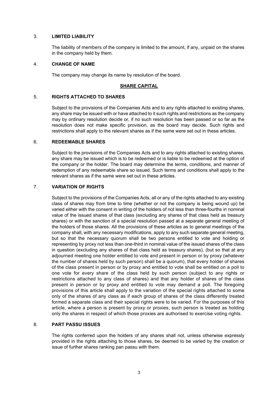 3 3. LIMITED LIABILITY The liability of members of the company is limited to the amount, if any, unpaid on the shares in the company held by them. 4. CHANGE OF NAME The company may change its name by resolution of the board. SHARE CAPITAL 5. RIGHTS ATTACHED TO SHARES Subject to the provisions of the Companies Acts and to any rights attached to existing shares, any share may be issued with or have attached to it such rights and restrictions as the company may by ordinary resolution decide or, if no such resolution has been passed or so far as the resolution does not make specific provision, as the board may decide. Such rights and restrictions shall apply to the relevant shares as if the same were set out in these articles. 6. REDEEMABLE SHARES Subject to the provisions of the Companies Acts and to any rights attached to existing shares, any share may be issued which is to be redeemed or is liable to be redeemed at the option of the company or the holder. The board may determine the terms, conditions, and manner of redemption of any redeemable share so issued. Such terms and conditions shall apply to the relevant shares as if the same were set out in these articles. 7. VARIATION OF RIGHTS Subject to the provisions of the Companies Acts, all or any of the rights attached to any existing class of shares may from time to time (whether or not the company is being wound up) be varied either with the consent in writing of the holders of not less than three-fourths in nominal value of the issued shares of that class (excluding any shares of that class held as treasury shares) or with the sanction of a special resolution passed at a separate general meeting of the holders of those shares. All the provisions of these articles as to general meetings of the company shall, with any necessary modifications, apply to any such separate general meeting, but so that the necessary quorum shall be two persons entitled to vote and holding or representing by proxy not less than one-third in nominal value of the issued shares of the class in question (excluding any shares of that class held as treasury shares), (but so that at any adjourned meeting one holder entitled to vote and present in person or by proxy (whatever the number of shares held by such person) shall be a quorum), that every holder of shares of the class present in person or by proxy and entitled to vote shall be entitled on a poll to one vote for every share of the class held by such person (subject to any rights or restrictions attached to any class of shares) and that any holder of shares of the class present in person or by proxy and entitled to vote may demand a poll. The foregoing provisions of this article shall apply to the variation of the special rights attached to some only of the shares of any class as if each group of shares of the class differently treated formed a separate class and their special rights were to be varied. For the purposes of this article, where a person is present by proxy or proxies, such person is treated as holding only the shares in respect of which those proxies are authorised to exercise voting rights. 8. PART PASSU ISSUES The rights conferred upon the holders of any shares shall not, unless otherwise expressly provided in the rights attaching to those shares, be deemed to be varied by the creation or issue of further shares ranking pan passu with them.