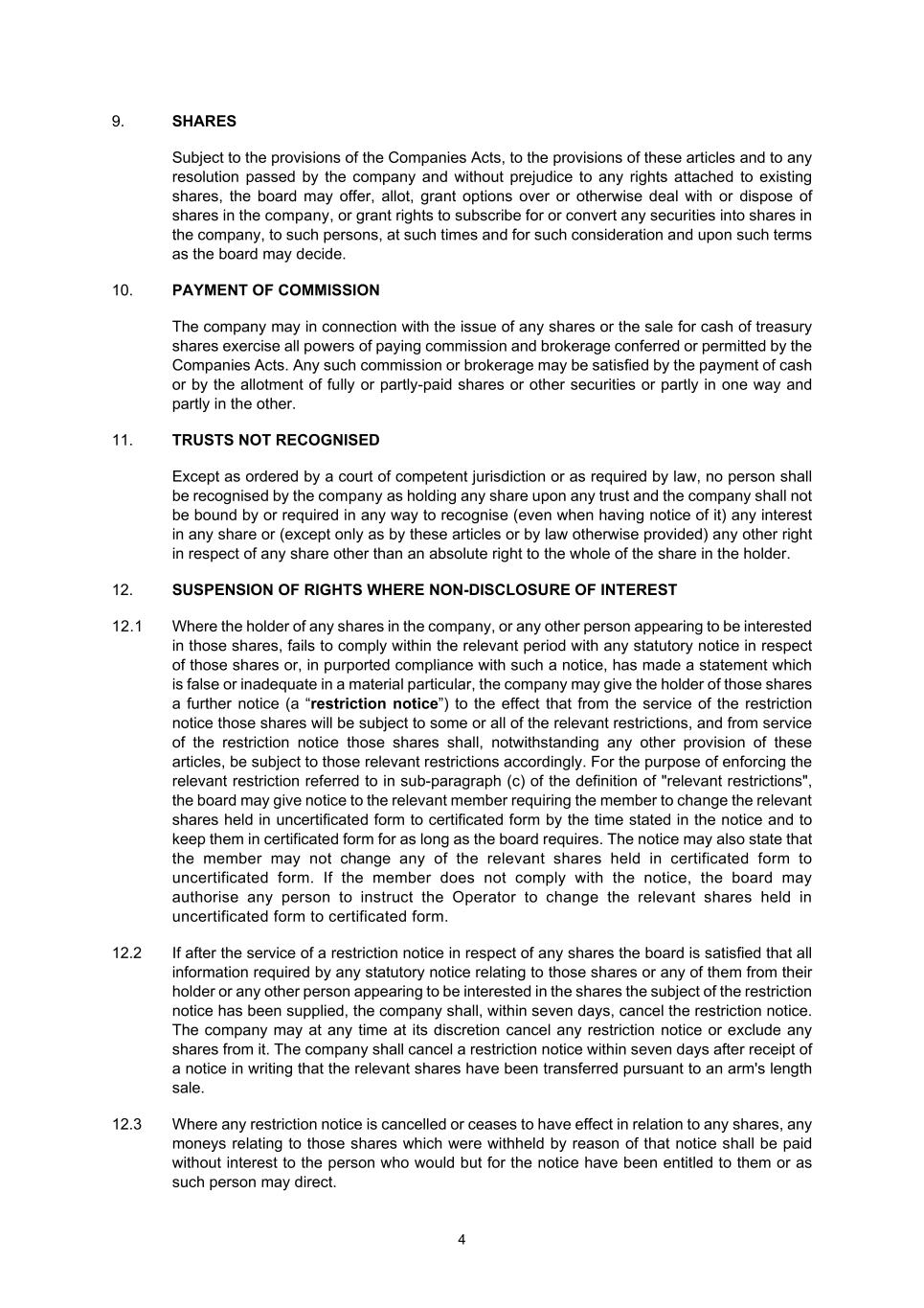 4 9. SHARES Subject to the provisions of the Companies Acts, to the provisions of these articles and to any resolution passed by the company and without prejudice to any rights attached to existing shares, the board may offer, allot, grant options over or otherwise deal with or dispose of shares in the company, or grant rights to subscribe for or convert any securities into shares in the company, to such persons, at such times and for such consideration and upon such terms as the board may decide. 10. PAYMENT OF COMMISSION The company may in connection with the issue of any shares or the sale for cash of treasury shares exercise all powers of paying commission and brokerage conferred or permitted by the Companies Acts. Any such commission or brokerage may be satisfied by the payment of cash or by the allotment of fully or partly-paid shares or other securities or partly in one way and partly in the other. 11. TRUSTS NOT RECOGNISED Except as ordered by a court of competent jurisdiction or as required by law, no person shall be recognised by the company as holding any share upon any trust and the company shall not be bound by or required in any way to recognise (even when having notice of it) any interest in any share or (except only as by these articles or by law otherwise provided) any other right in respect of any share other than an absolute right to the whole of the share in the holder. 12. SUSPENSION OF RIGHTS WHERE NON-DISCLOSURE OF INTEREST 12.1 Where the holder of any shares in the company, or any other person appearing to be interested in those shares, fails to comply within the relevant period with any statutory notice in respect of those shares or, in purported compliance with such a notice, has made a statement which is false or inadequate in a material particular, the company may give the holder of those shares a further notice (a “restriction notice”) to the effect that from the service of the restriction notice those shares will be subject to some or all of the relevant restrictions, and from service of the restriction notice those shares shall, notwithstanding any other provision of these articles, be subject to those relevant restrictions accordingly. For the purpose of enforcing the relevant restriction referred to in sub-paragraph (c) of the definition of "relevant restrictions", the board may give notice to the relevant member requiring the member to change the relevant shares held in uncertificated form to certificated form by the time stated in the notice and to keep them in certificated form for as long as the board requires. The notice may also state that the member may not change any of the relevant shares held in certificated form to uncertificated form. If the member does not comply with the notice, the board may authorise any person to instruct the Operator to change the relevant shares held in uncertificated form to certificated form. 12.2 If after the service of a restriction notice in respect of any shares the board is satisfied that all information required by any statutory notice relating to those shares or any of them from their holder or any other person appearing to be interested in the shares the subject of the restriction notice has been supplied, the company shall, within seven days, cancel the restriction notice. The company may at any time at its discretion cancel any restriction notice or exclude any shares from it. The company shall cancel a restriction notice within seven days after receipt of a notice in writing that the relevant shares have been transferred pursuant to an arm's length sale. 12.3 Where any restriction notice is cancelled or ceases to have effect in relation to any shares, any moneys relating to those shares which were withheld by reason of that notice shall be paid without interest to the person who would but for the notice have been entitled to them or as such person may direct.