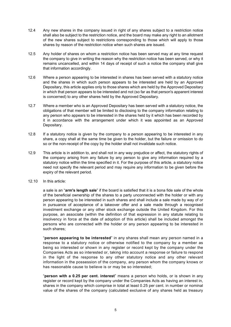 5 12.4 Any new shares in the company issued in right of any shares subject to a restriction notice shall also be subject to the restriction notice, and the board may make any right to an allotment of the new shares subject to restrictions corresponding to those which will apply to those shares by reason of the restriction notice when such shares are issued. 12.5 Any holder of shares on whom a restriction notice has been served may at any time request the company to give in writing the reason why the restriction notice has been served, or why it remains uncancelled, and within 14 days of receipt of such a notice the company shall give that information accordingly. 12.6 Where a person appearing to be interested in shares has been served with a statutory notice and the shares in which such person appears to be interested are held by an Approved Depositary, this article applies only to those shares which are held by the Approved Depositary in which that person appears to be interested and not (so far as that person's apparent interest is concerned) to any other shares held by the Approved Depositary. 12.7 Where a member who is an Approved Depositary has been served with a statutory notice, the obligations of that member will be limited to disclosing to the company information relating to any person who appears to be interested in the shares held by it which has been recorded by it in accordance with the arrangement under which it was appointed as an Approved Depositary. 12.8 If a statutory notice is given by the company to a person appearing to be interested in any share, a copy shall at the same time be given to the holder, but the failure or omission to do so or the non-receipt of the copy by the holder shall not invalidate such notice. 12.9 This article is in addition to, and shall not in any way prejudice or affect, the statutory rights of the company arising from any failure by any person to give any information required by a statutory notice within the time specified in it. For the purpose of this article, a statutory notice need not specify the relevant period and may require any information to be given before the expiry of the relevant period. 12.10 In this article: a sale is an “arm's length sale” if the board is satisfied that it is a bona fide sale of the whole of the beneficial ownership of the shares to a party unconnected with the holder or with any person appearing to be interested in such shares and shall include a sale made by way of or in pursuance of acceptance of a takeover offer and a sale made through a recognised investment exchange or any other stock exchange outside the United Kingdom. For this purpose, an associate (within the definition of that expression in any statute relating to insolvency in force at the date of adoption of this article) shall be included amongst the persons who are connected with the holder or any person appearing to be interested in such shares; “person appearing to be interested” in any shares shall mean any person named in a response to a statutory notice or otherwise notified to the company by a member as being so interested or shown in any register or record kept by the company under the Companies Acts as so interested or, taking into account a response or failure to respond in the light of the response to any other statutory notice and any other relevant information in the possession of the company, any person whom the company knows or has reasonable cause to believe is or may be so interested; “person with a 0.25 per cent. interest” means a person who holds, or is shown in any register or record kept by the company under the Companies Acts as having an interest in, shares in the company which comprise in total at least 0.25 per cent. in number or nominal value of the shares of the company (calculated exclusive of any shares held as treasury