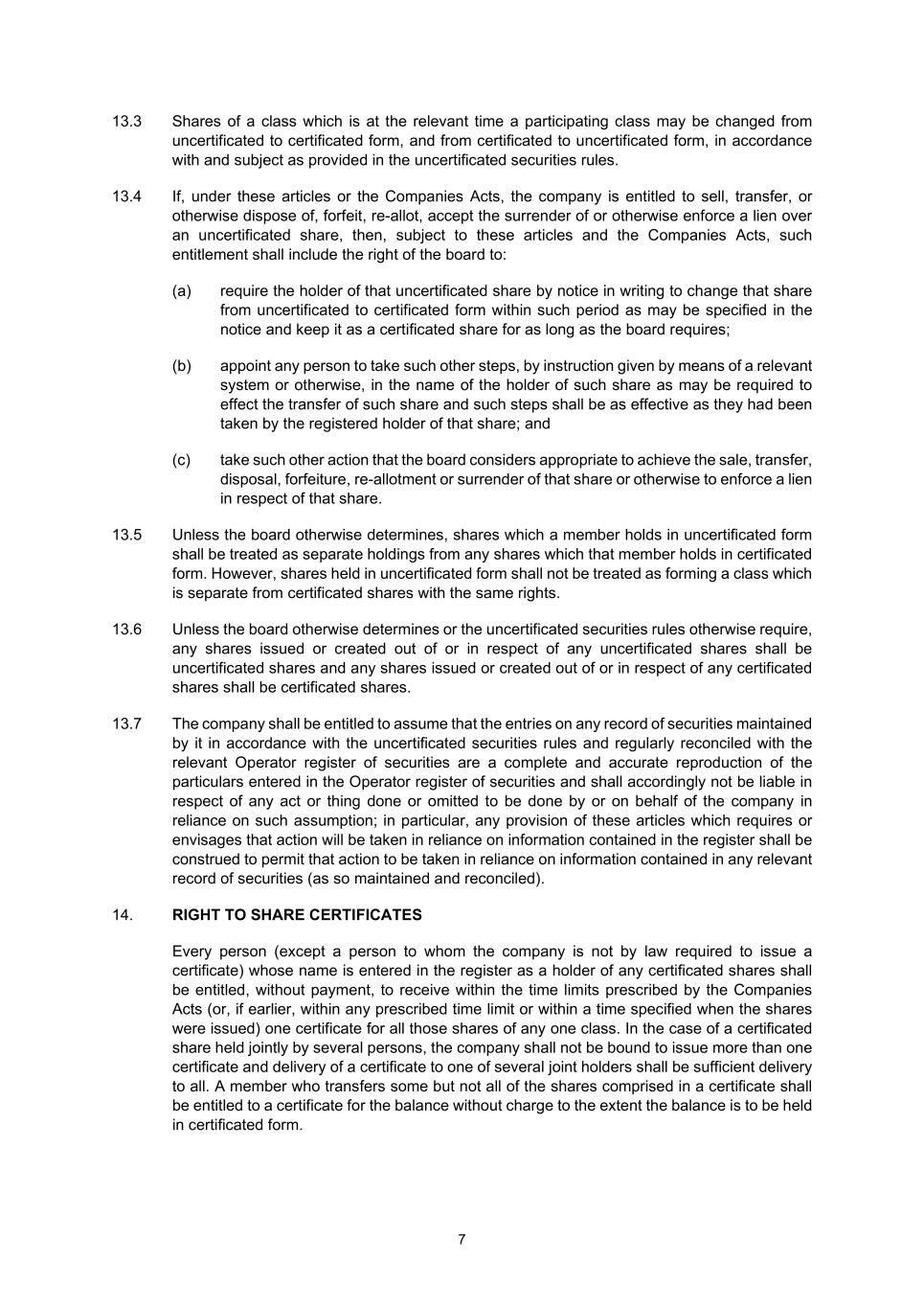 7 13.3 Shares of a class which is at the relevant time a participating class may be changed from uncertificated to certificated form, and from certificated to uncertificated form, in accordance with and subject as provided in the uncertificated securities rules. 13.4 If, under these articles or the Companies Acts, the company is entitled to sell, transfer, or otherwise dispose of, forfeit, re-allot, accept the surrender of or otherwise enforce a lien over an uncertificated share, then, subject to these articles and the Companies Acts, such entitlement shall include the right of the board to: (a) require the holder of that uncertificated share by notice in writing to change that share from uncertificated to certificated form within such period as may be specified in the notice and keep it as a certificated share for as long as the board requires; (b) appoint any person to take such other steps, by instruction given by means of a relevant system or otherwise, in the name of the holder of such share as may be required to effect the transfer of such share and such steps shall be as effective as they had been taken by the registered holder of that share; and (c) take such other action that the board considers appropriate to achieve the sale, transfer, disposal, forfeiture, re-allotment or surrender of that share or otherwise to enforce a lien in respect of that share. 13.5 Unless the board otherwise determines, shares which a member holds in uncertificated form shall be treated as separate holdings from any shares which that member holds in certificated form. However, shares held in uncertificated form shall not be treated as forming a class which is separate from certificated shares with the same rights. 13.6 Unless the board otherwise determines or the uncertificated securities rules otherwise require, any shares issued or created out of or in respect of any uncertificated shares shall be uncertificated shares and any shares issued or created out of or in respect of any certificated shares shall be certificated shares. 13.7 The company shall be entitled to assume that the entries on any record of securities maintained by it in accordance with the uncertificated securities rules and regularly reconciled with the relevant Operator register of securities are a complete and accurate reproduction of the particulars entered in the Operator register of securities and shall accordingly not be liable in respect of any act or thing done or omitted to be done by or on behalf of the company in reliance on such assumption; in particular, any provision of these articles which requires or envisages that action will be taken in reliance on information contained in the register shall be construed to permit that action to be taken in reliance on information contained in any relevant record of securities (as so maintained and reconciled). 14. RIGHT TO SHARE CERTIFICATES Every person (except a person to whom the company is not by law required to issue a certificate) whose name is entered in the register as a holder of any certificated shares shall be entitled, without payment, to receive within the time limits prescribed by the Companies Acts (or, if earlier, within any prescribed time limit or within a time specified when the shares were issued) one certificate for all those shares of any one class. In the case of a certificated share held jointly by several persons, the company shall not be bound to issue more than one certificate and delivery of a certificate to one of several joint holders shall be sufficient delivery to all. A member who transfers some but not all of the shares comprised in a certificate shall be entitled to a certificate for the balance without charge to the extent the balance is to be held in certificated form.