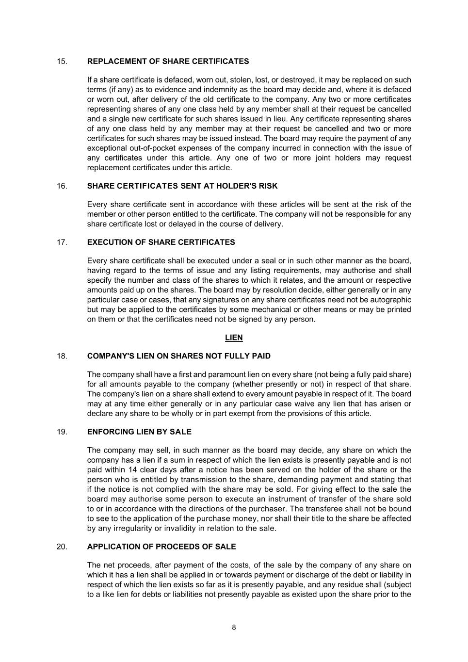 8 15. REPLACEMENT OF SHARE CERTIFICATES If a share certificate is defaced, worn out, stolen, lost, or destroyed, it may be replaced on such terms (if any) as to evidence and indemnity as the board may decide and, where it is defaced or worn out, after delivery of the old certificate to the company. Any two or more certificates representing shares of any one class held by any member shall at their request be cancelled and a single new certificate for such shares issued in lieu. Any certificate representing shares of any one class held by any member may at their request be cancelled and two or more certificates for such shares may be issued instead. The board may require the payment of any exceptional out-of-pocket expenses of the company incurred in connection with the issue of any certificates under this article. Any one of two or more joint holders may request replacement certificates under this article. 16. SHARE CERTIFICATES SENT AT HOLDER'S RISK Every share certificate sent in accordance with these articles will be sent at the risk of the member or other person entitled to the certificate. The company will not be responsible for any share certificate lost or delayed in the course of delivery. 17. EXECUTION OF SHARE CERTIFICATES Every share certificate shall be executed under a seal or in such other manner as the board, having regard to the terms of issue and any listing requirements, may authorise and shall specify the number and class of the shares to which it relates, and the amount or respective amounts paid up on the shares. The board may by resolution decide, either generally or in any particular case or cases, that any signatures on any share certificates need not be autographic but may be applied to the certificates by some mechanical or other means or may be printed on them or that the certificates need not be signed by any person. LIEN 18. COMPANY'S LIEN ON SHARES NOT FULLY PAID The company shall have a first and paramount lien on every share (not being a fully paid share) for all amounts payable to the company (whether presently or not) in respect of that share. The company's lien on a share shall extend to every amount payable in respect of it. The board may at any time either generally or in any particular case waive any lien that has arisen or declare any share to be wholly or in part exempt from the provisions of this article. 19. ENFORCING LIEN BY SALE The company may sell, in such manner as the board may decide, any share on which the company has a lien if a sum in respect of which the lien exists is presently payable and is not paid within 14 clear days after a notice has been served on the holder of the share or the person who is entitled by transmission to the share, demanding payment and stating that if the notice is not complied with the share may be sold. For giving effect to the sale the board may authorise some person to execute an instrument of transfer of the share sold to or in accordance with the directions of the purchaser. The transferee shall not be bound to see to the application of the purchase money, nor shall their title to the share be affected by any irregularity or invalidity in relation to the sale. 20. APPLICATION OF PROCEEDS OF SALE The net proceeds, after payment of the costs, of the sale by the company of any share on which it has a lien shall be applied in or towards payment or discharge of the debt or liability in respect of which the lien exists so far as it is presently payable, and any residue shall (subject to a like lien for debts or liabilities not presently payable as existed upon the share prior to the