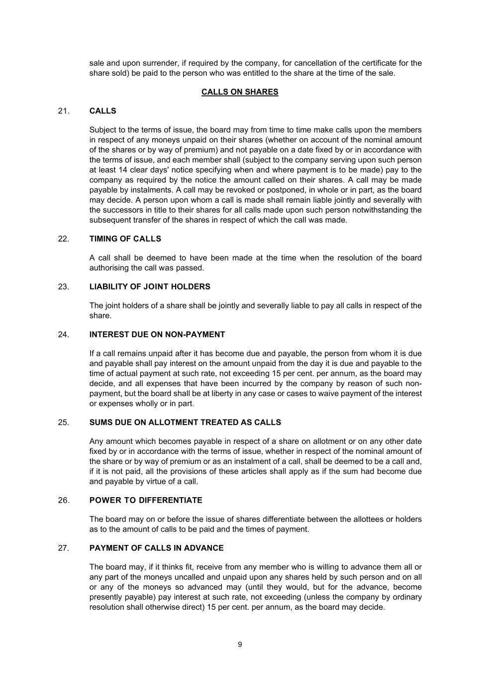 9 sale and upon surrender, if required by the company, for cancellation of the certificate for the share sold) be paid to the person who was entitled to the share at the time of the sale. CALLS ON SHARES 21. CALLS Subject to the terms of issue, the board may from time to time make calls upon the members in respect of any moneys unpaid on their shares (whether on account of the nominal amount of the shares or by way of premium) and not payable on a date fixed by or in accordance with the terms of issue, and each member shall (subject to the company serving upon such person at least 14 clear days' notice specifying when and where payment is to be made) pay to the company as required by the notice the amount called on their shares. A call may be made payable by instalments. A call may be revoked or postponed, in whole or in part, as the board may decide. A person upon whom a call is made shall remain liable jointly and severally with the successors in title to their shares for all calls made upon such person notwithstanding the subsequent transfer of the shares in respect of which the call was made. 22. TIMING OF CALLS A call shall be deemed to have been made at the time when the resolution of the board authorising the call was passed. 23. LIABILITY OF JOINT HOLDERS The joint holders of a share shall be jointly and severally liable to pay all calls in respect of the share. 24. INTEREST DUE ON NON-PAYMENT If a call remains unpaid after it has become due and payable, the person from whom it is due and payable shall pay interest on the amount unpaid from the day it is due and payable to the time of actual payment at such rate, not exceeding 15 per cent. per annum, as the board may decide, and all expenses that have been incurred by the company by reason of such non- payment, but the board shall be at liberty in any case or cases to waive payment of the interest or expenses wholly or in part. 25. SUMS DUE ON ALLOTMENT TREATED AS CALLS Any amount which becomes payable in respect of a share on allotment or on any other date fixed by or in accordance with the terms of issue, whether in respect of the nominal amount of the share or by way of premium or as an instalment of a call, shall be deemed to be a call and, if it is not paid, all the provisions of these articles shall apply as if the sum had become due and payable by virtue of a call. 26. POWER TO DIFFERENTIATE The board may on or before the issue of shares differentiate between the allottees or holders as to the amount of calls to be paid and the times of payment. 27. PAYMENT OF CALLS IN ADVANCE The board may, if it thinks fit, receive from any member who is willing to advance them all or any part of the moneys uncalled and unpaid upon any shares held by such person and on all or any of the moneys so advanced may (until they would, but for the advance, become presently payable) pay interest at such rate, not exceeding (unless the company by ordinary resolution shall otherwise direct) 15 per cent. per annum, as the board may decide.