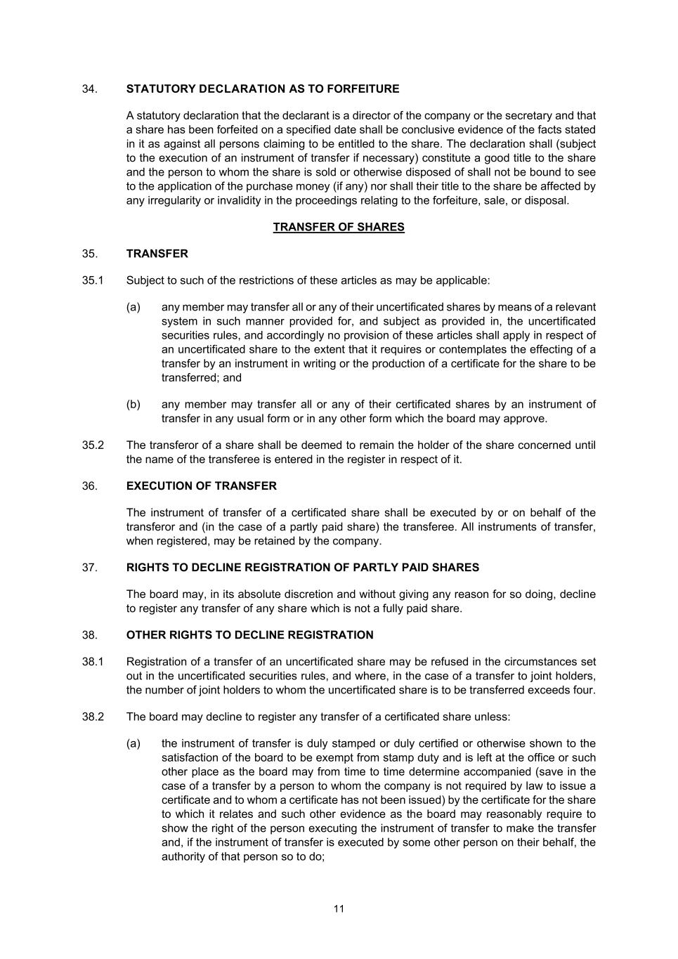 11 34. STATUTORY DECLARATION AS TO FORFEITURE A statutory declaration that the declarant is a director of the company or the secretary and that a share has been forfeited on a specified date shall be conclusive evidence of the facts stated in it as against all persons claiming to be entitled to the share. The declaration shall (subject to the execution of an instrument of transfer if necessary) constitute a good title to the share and the person to whom the share is sold or otherwise disposed of shall not be bound to see to the application of the purchase money (if any) nor shall their title to the share be affected by any irregularity or invalidity in the proceedings relating to the forfeiture, sale, or disposal. TRANSFER OF SHARES 35. TRANSFER 35.1 Subject to such of the restrictions of these articles as may be applicable: (a) any member may transfer all or any of their uncertificated shares by means of a relevant system in such manner provided for, and subject as provided in, the uncertificated securities rules, and accordingly no provision of these articles shall apply in respect of an uncertificated share to the extent that it requires or contemplates the effecting of a transfer by an instrument in writing or the production of a certificate for the share to be transferred; and (b) any member may transfer all or any of their certificated shares by an instrument of transfer in any usual form or in any other form which the board may approve. 35.2 The transferor of a share shall be deemed to remain the holder of the share concerned until the name of the transferee is entered in the register in respect of it. 36. EXECUTION OF TRANSFER The instrument of transfer of a certificated share shall be executed by or on behalf of the transferor and (in the case of a partly paid share) the transferee. All instruments of transfer, when registered, may be retained by the company. 37. RIGHTS TO DECLINE REGISTRATION OF PARTLY PAID SHARES The board may, in its absolute discretion and without giving any reason for so doing, decline to register any transfer of any share which is not a fully paid share. 38. OTHER RIGHTS TO DECLINE REGISTRATION 38.1 Registration of a transfer of an uncertificated share may be refused in the circumstances set out in the uncertificated securities rules, and where, in the case of a transfer to joint holders, the number of joint holders to whom the uncertificated share is to be transferred exceeds four. 38.2 The board may decline to register any transfer of a certificated share unless: (a) the instrument of transfer is duly stamped or duly certified or otherwise shown to the satisfaction of the board to be exempt from stamp duty and is left at the office or such other place as the board may from time to time determine accompanied (save in the case of a transfer by a person to whom the company is not required by law to issue a certificate and to whom a certificate has not been issued) by the certificate for the share to which it relates and such other evidence as the board may reasonably require to show the right of the person executing the instrument of transfer to make the transfer and, if the instrument of transfer is executed by some other person on their behalf, the authority of that person so to do;