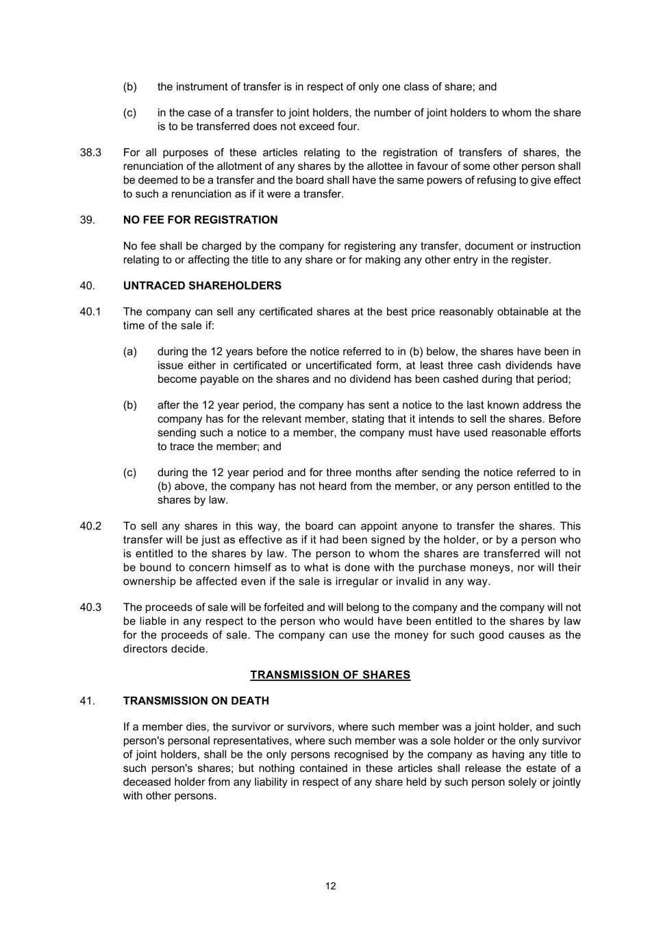 12 (b) the instrument of transfer is in respect of only one class of share; and (c) in the case of a transfer to joint holders, the number of joint holders to whom the share is to be transferred does not exceed four. 38.3 For all purposes of these articles relating to the registration of transfers of shares, the renunciation of the allotment of any shares by the allottee in favour of some other person shall be deemed to be a transfer and the board shall have the same powers of refusing to give effect to such a renunciation as if it were a transfer. 39. NO FEE FOR REGISTRATION No fee shall be charged by the company for registering any transfer, document or instruction relating to or affecting the title to any share or for making any other entry in the register. 40. UNTRACED SHAREHOLDERS 40.1 The company can sell any certificated shares at the best price reasonably obtainable at the time of the sale if: (a) during the 12 years before the notice referred to in (b) below, the shares have been in issue either in certificated or uncertificated form, at least three cash dividends have become payable on the shares and no dividend has been cashed during that period; (b) after the 12 year period, the company has sent a notice to the last known address the company has for the relevant member, stating that it intends to sell the shares. Before sending such a notice to a member, the company must have used reasonable efforts to trace the member; and (c) during the 12 year period and for three months after sending the notice referred to in (b) above, the company has not heard from the member, or any person entitled to the shares by law. 40.2 To sell any shares in this way, the board can appoint anyone to transfer the shares. This transfer will be just as effective as if it had been signed by the holder, or by a person who is entitled to the shares by law. The person to whom the shares are transferred will not be bound to concern himself as to what is done with the purchase moneys, nor will their ownership be affected even if the sale is irregular or invalid in any way. 40.3 The proceeds of sale will be forfeited and will belong to the company and the company will not be liable in any respect to the person who would have been entitled to the shares by law for the proceeds of sale. The company can use the money for such good causes as the directors decide. TRANSMISSION OF SHARES 41. TRANSMISSION ON DEATH If a member dies, the survivor or survivors, where such member was a joint holder, and such person's personal representatives, where such member was a sole holder or the only survivor of joint holders, shall be the only persons recognised by the company as having any title to such person's shares; but nothing contained in these articles shall release the estate of a deceased holder from any liability in respect of any share held by such person solely or jointly with other persons.