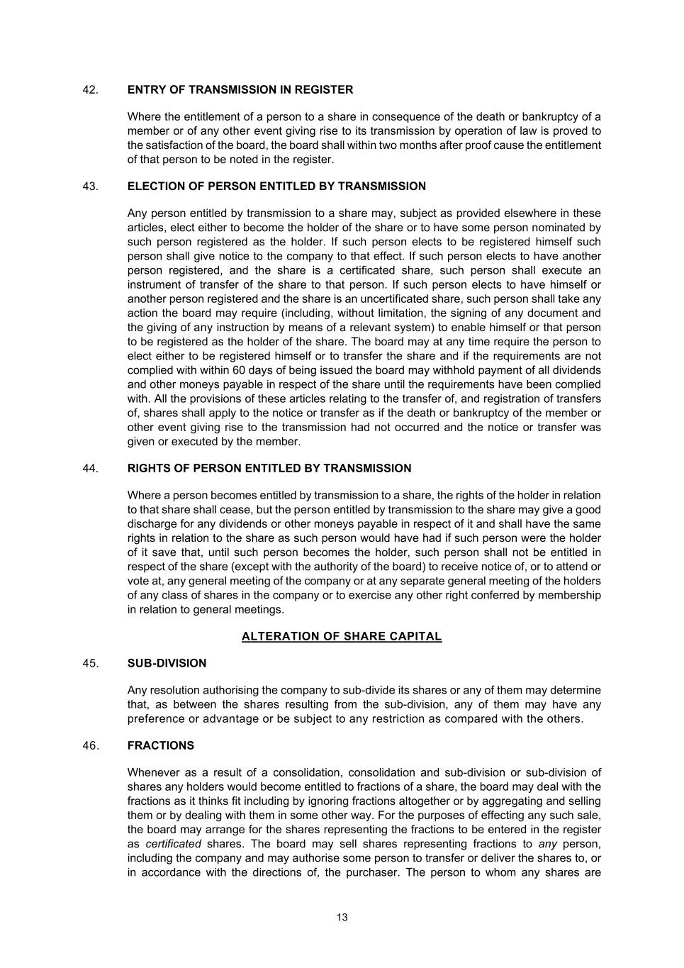 13 42. ENTRY OF TRANSMISSION IN REGISTER Where the entitlement of a person to a share in consequence of the death or bankruptcy of a member or of any other event giving rise to its transmission by operation of law is proved to the satisfaction of the board, the board shall within two months after proof cause the entitlement of that person to be noted in the register. 43. ELECTION OF PERSON ENTITLED BY TRANSMISSION Any person entitled by transmission to a share may, subject as provided elsewhere in these articles, elect either to become the holder of the share or to have some person nominated by such person registered as the holder. If such person elects to be registered himself such person shall give notice to the company to that effect. If such person elects to have another person registered, and the share is a certificated share, such person shall execute an instrument of transfer of the share to that person. If such person elects to have himself or another person registered and the share is an uncertificated share, such person shall take any action the board may require (including, without limitation, the signing of any document and the giving of any instruction by means of a relevant system) to enable himself or that person to be registered as the holder of the share. The board may at any time require the person to elect either to be registered himself or to transfer the share and if the requirements are not complied with within 60 days of being issued the board may withhold payment of all dividends and other moneys payable in respect of the share until the requirements have been complied with. All the provisions of these articles relating to the transfer of, and registration of transfers of, shares shall apply to the notice or transfer as if the death or bankruptcy of the member or other event giving rise to the transmission had not occurred and the notice or transfer was given or executed by the member. 44. RIGHTS OF PERSON ENTITLED BY TRANSMISSION Where a person becomes entitled by transmission to a share, the rights of the holder in relation to that share shall cease, but the person entitled by transmission to the share may give a good discharge for any dividends or other moneys payable in respect of it and shall have the same rights in relation to the share as such person would have had if such person were the holder of it save that, until such person becomes the holder, such person shall not be entitled in respect of the share (except with the authority of the board) to receive notice of, or to attend or vote at, any general meeting of the company or at any separate general meeting of the holders of any class of shares in the company or to exercise any other right conferred by membership in relation to general meetings. ALTERATION OF SHARE CAPITAL 45. SUB-DIVISION Any resolution authorising the company to sub-divide its shares or any of them may determine that, as between the shares resulting from the sub-division, any of them may have any preference or advantage or be subject to any restriction as compared with the others. 46. FRACTIONS Whenever as a result of a consolidation, consolidation and sub-division or sub-division of shares any holders would become entitled to fractions of a share, the board may deal with the fractions as it thinks fit including by ignoring fractions altogether or by aggregating and selling them or by dealing with them in some other way. For the purposes of effecting any such sale, the board may arrange for the shares representing the fractions to be entered in the register as certificated shares. The board may sell shares representing fractions to any person, including the company and may authorise some person to transfer or deliver the shares to, or in accordance with the directions of, the purchaser. The person to whom any shares are
