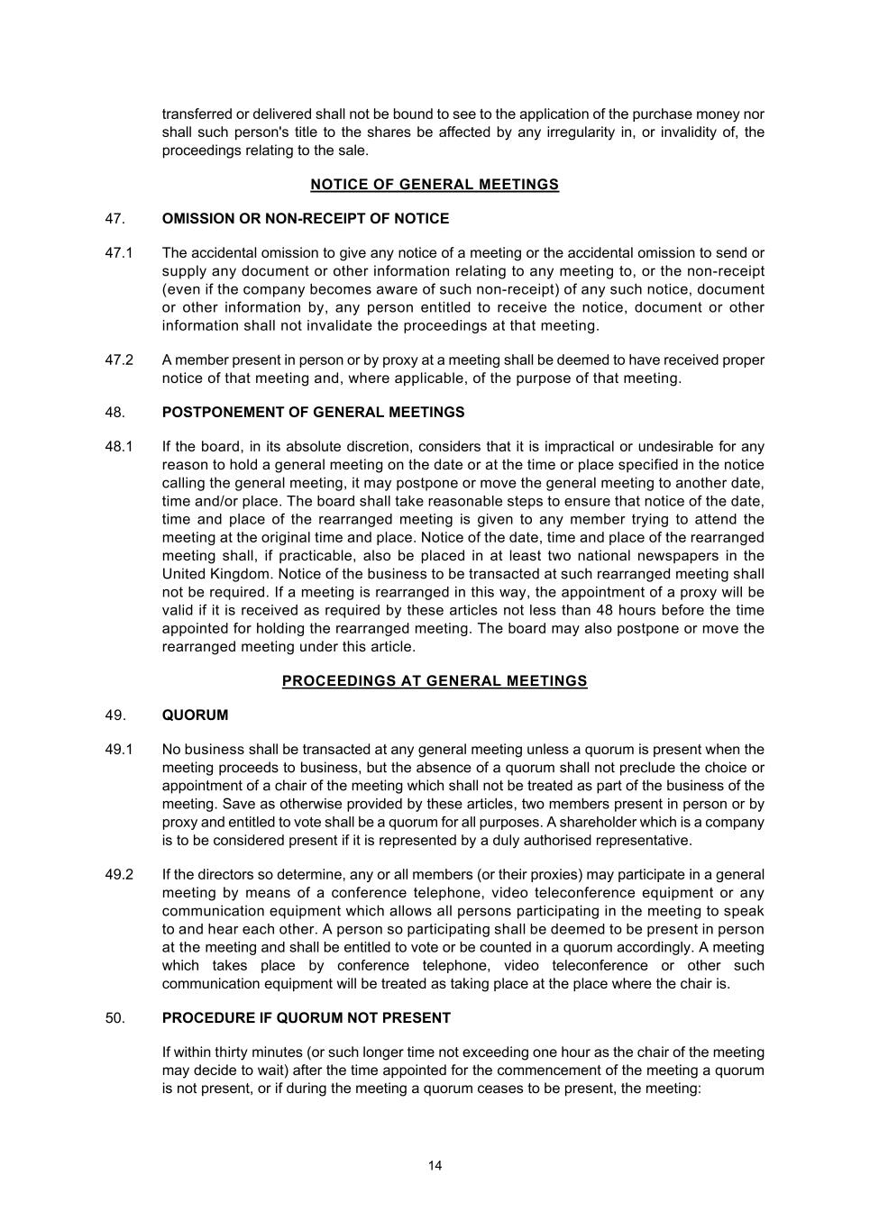 14 transferred or delivered shall not be bound to see to the application of the purchase money nor shall such person's title to the shares be affected by any irregularity in, or invalidity of, the proceedings relating to the sale. NOTICE OF GENERAL MEETINGS 47. OMISSION OR NON-RECEIPT OF NOTICE 47.1 The accidental omission to give any notice of a meeting or the accidental omission to send or supply any document or other information relating to any meeting to, or the non-receipt (even if the company becomes aware of such non-receipt) of any such notice, document or other information by, any person entitled to receive the notice, document or other information shall not invalidate the proceedings at that meeting. 47.2 A member present in person or by proxy at a meeting shall be deemed to have received proper notice of that meeting and, where applicable, of the purpose of that meeting. 48. POSTPONEMENT OF GENERAL MEETINGS 48.1 If the board, in its absolute discretion, considers that it is impractical or undesirable for any reason to hold a general meeting on the date or at the time or place specified in the notice calling the general meeting, it may postpone or move the general meeting to another date, time and/or place. The board shall take reasonable steps to ensure that notice of the date, time and place of the rearranged meeting is given to any member trying to attend the meeting at the original time and place. Notice of the date, time and place of the rearranged meeting shall, if practicable, also be placed in at least two national newspapers in the United Kingdom. Notice of the business to be transacted at such rearranged meeting shall not be required. If a meeting is rearranged in this way, the appointment of a proxy will be valid if it is received as required by these articles not less than 48 hours before the time appointed for holding the rearranged meeting. The board may also postpone or move the rearranged meeting under this article. PROCEEDINGS AT GENERAL MEETINGS 49. QUORUM 49.1 No business shall be transacted at any general meeting unless a quorum is present when the meeting proceeds to business, but the absence of a quorum shall not preclude the choice or appointment of a chair of the meeting which shall not be treated as part of the business of the meeting. Save as otherwise provided by these articles, two members present in person or by proxy and entitled to vote shall be a quorum for all purposes. A shareholder which is a company is to be considered present if it is represented by a duly authorised representative. 49.2 If the directors so determine, any or all members (or their proxies) may participate in a general meeting by means of a conference telephone, video teleconference equipment or any communication equipment which allows all persons participating in the meeting to speak to and hear each other. A person so participating shall be deemed to be present in person at the meeting and shall be entitled to vote or be counted in a quorum accordingly. A meeting which takes place by conference telephone, video teleconference or other such communication equipment will be treated as taking place at the place where the chair is. 50. PROCEDURE IF QUORUM NOT PRESENT If within thirty minutes (or such longer time not exceeding one hour as the chair of the meeting may decide to wait) after the time appointed for the commencement of the meeting a quorum is not present, or if during the meeting a quorum ceases to be present, the meeting: