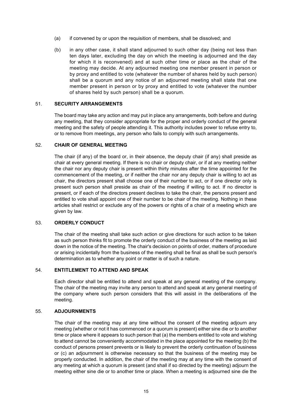 15 (a) if convened by or upon the requisition of members, shall be dissolved; and (b) in any other case, it shall stand adjourned to such other day (being not less than ten days later, excluding the day on which the meeting is adjourned and the day for which it is reconvened) and at such other time or place as the chair of the meeting may decide. At any adjourned meeting one member present in person or by proxy and entitled to vote (whatever the number of shares held by such person) shall be a quorum and any notice of an adjourned meeting shall state that one member present in person or by proxy and entitled to vote (whatever the number of shares held by such person) shall be a quorum. 51. SECURITY ARRANGEMENTS The board may take any action and may put in place any arrangements, both before and during any meeting, that they consider appropriate for the proper and orderly conduct of the general meeting and the safety of people attending it. This authority includes power to refuse entry to, or to remove from meetings, any person who fails to comply with such arrangements. 52. CHAIR OF GENERAL MEETING The chair (if any) of the board or, in their absence, the deputy chair (if any) shall preside as chair at every general meeting. If there is no chair or deputy chair, or if at any meeting neither the chair nor any deputy chair is present within thirty minutes after the time appointed for the commencement of the meeting, or if neither the chair nor any deputy chair is willing to act as chair, the directors present shall choose one of their number to act, or if one director only is present such person shall preside as chair of the meeting if willing to act. If no director is present, or if each of the directors present declines to take the chair, the persons present and entitled to vote shall appoint one of their number to be chair of the meeting. Nothing in these articles shall restrict or exclude any of the powers or rights of a chair of a meeting which are given by law. 53. ORDERLY CONDUCT The chair of the meeting shall take such action or give directions for such action to be taken as such person thinks fit to promote the orderly conduct of the business of the meeting as laid down in the notice of the meeting. The chair's decision on points of order, matters of procedure or arising incidentally from the business of the meeting shall be final as shall be such person's determination as to whether any point or matter is of such a nature. 54. ENTITLEMENT TO ATTEND AND SPEAK Each director shall be entitled to attend and speak at any general meeting of the company. The chair of the meeting may invite any person to attend and speak at any general meeting of the company where such person considers that this will assist in the deliberations of the meeting. 55. ADJOURNMENTS The chair of the meeting may at any time without the consent of the meeting adjourn any meeting (whether or not it has commenced or a quorum is present) either sine die or to another time or place where it appears to such person that (a) the members entitled to vote and wishing to attend cannot be conveniently accommodated in the place appointed for the meeting (b) the conduct of persons present prevents or is likely to prevent the orderly continuation of business or (c) an adjournment is otherwise necessary so that the business of the meeting may be properly conducted. In addition, the chair of the meeting may at any time with the consent of any meeting at which a quorum is present (and shall if so directed by the meeting) adjourn the meeting either sine die or to another time or place. When a meeting is adjourned sine die the