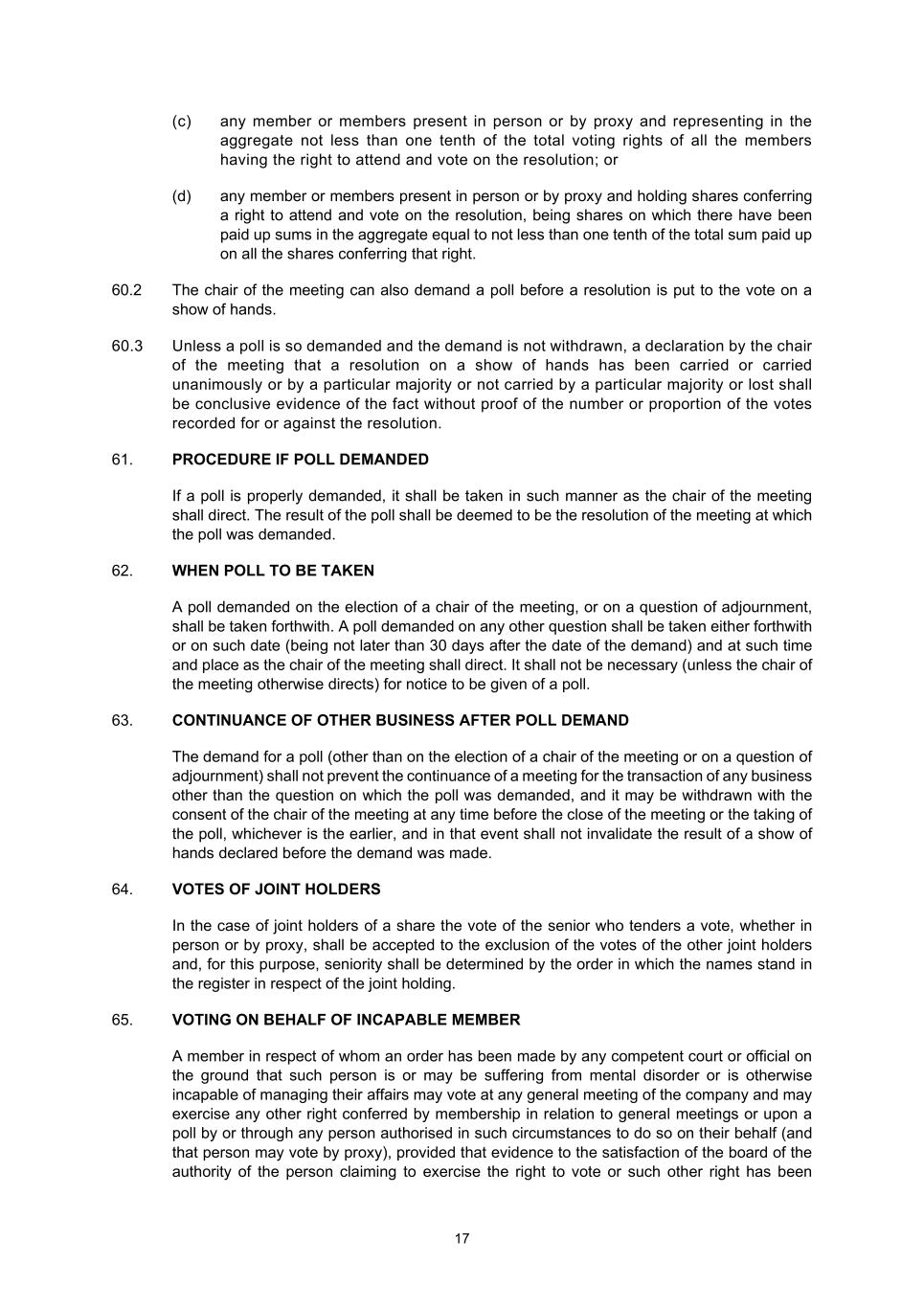 17 (c) any member or members present in person or by proxy and representing in the aggregate not less than one tenth of the total voting rights of all the members having the right to attend and vote on the resolution; or (d) any member or members present in person or by proxy and holding shares conferring a right to attend and vote on the resolution, being shares on which there have been paid up sums in the aggregate equal to not less than one tenth of the total sum paid up on all the shares conferring that right. 60.2 The chair of the meeting can also demand a poll before a resolution is put to the vote on a show of hands. 60.3 Unless a poll is so demanded and the demand is not withdrawn, a declaration by the chair of the meeting that a resolution on a show of hands has been carried or carried unanimously or by a particular majority or not carried by a particular majority or lost shall be conclusive evidence of the fact without proof of the number or proportion of the votes recorded for or against the resolution. 61. PROCEDURE IF POLL DEMANDED If a poll is properly demanded, it shall be taken in such manner as the chair of the meeting shall direct. The result of the poll shall be deemed to be the resolution of the meeting at which the poll was demanded. 62. WHEN POLL TO BE TAKEN A poll demanded on the election of a chair of the meeting, or on a question of adjournment, shall be taken forthwith. A poll demanded on any other question shall be taken either forthwith or on such date (being not later than 30 days after the date of the demand) and at such time and place as the chair of the meeting shall direct. It shall not be necessary (unless the chair of the meeting otherwise directs) for notice to be given of a poll. 63. CONTINUANCE OF OTHER BUSINESS AFTER POLL DEMAND The demand for a poll (other than on the election of a chair of the meeting or on a question of adjournment) shall not prevent the continuance of a meeting for the transaction of any business other than the question on which the poll was demanded, and it may be withdrawn with the consent of the chair of the meeting at any time before the close of the meeting or the taking of the poll, whichever is the earlier, and in that event shall not invalidate the result of a show of hands declared before the demand was made. 64. VOTES OF JOINT HOLDERS In the case of joint holders of a share the vote of the senior who tenders a vote, whether in person or by proxy, shall be accepted to the exclusion of the votes of the other joint holders and, for this purpose, seniority shall be determined by the order in which the names stand in the register in respect of the joint holding. 65. VOTING ON BEHALF OF INCAPABLE MEMBER A member in respect of whom an order has been made by any competent court or official on the ground that such person is or may be suffering from mental disorder or is otherwise incapable of managing their affairs may vote at any general meeting of the company and may exercise any other right conferred by membership in relation to general meetings or upon a poll by or through any person authorised in such circumstances to do so on their behalf (and that person may vote by proxy), provided that evidence to the satisfaction of the board of the authority of the person claiming to exercise the right to vote or such other right has been