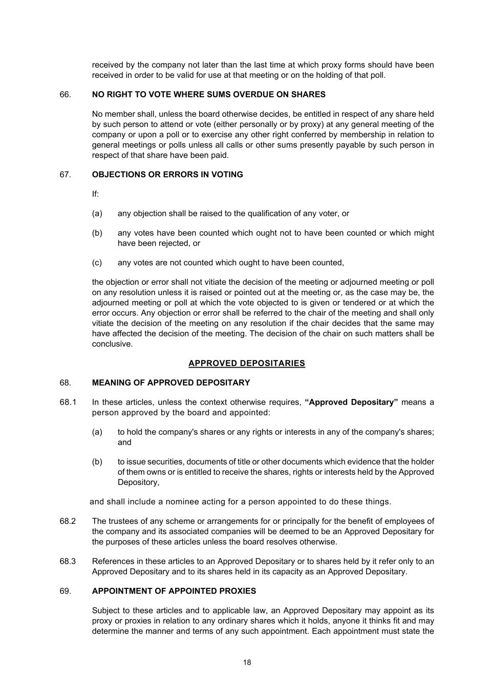 18 received by the company not later than the last time at which proxy forms should have been received in order to be valid for use at that meeting or on the holding of that poll. 66. NO RIGHT TO VOTE WHERE SUMS OVERDUE ON SHARES No member shall, unless the board otherwise decides, be entitled in respect of any share held by such person to attend or vote (either personally or by proxy) at any general meeting of the company or upon a poll or to exercise any other right conferred by membership in relation to general meetings or polls unless all calls or other sums presently payable by such person in respect of that share have been paid. 67. OBJECTIONS OR ERRORS IN VOTING If: (a) any objection shall be raised to the qualification of any voter, or (b) any votes have been counted which ought not to have been counted or which might have been rejected, or (c) any votes are not counted which ought to have been counted, the objection or error shall not vitiate the decision of the meeting or adjourned meeting or poll on any resolution unless it is raised or pointed out at the meeting or, as the case may be, the adjourned meeting or poll at which the vote objected to is given or tendered or at which the error occurs. Any objection or error shall be referred to the chair of the meeting and shall only vitiate the decision of the meeting on any resolution if the chair decides that the same may have affected the decision of the meeting. The decision of the chair on such matters shall be conclusive. APPROVED DEPOSITARIES 68. MEANING OF APPROVED DEPOSITARY 68.1 In these articles, unless the context otherwise requires, “Approved Depositary” means a person approved by the board and appointed: (a) to hold the company's shares or any rights or interests in any of the company's shares; and (b) to issue securities, documents of title or other documents which evidence that the holder of them owns or is entitled to receive the shares, rights or interests held by the Approved Depository, and shall include a nominee acting for a person appointed to do these things. 68.2 The trustees of any scheme or arrangements for or principally for the benefit of employees of the company and its associated companies will be deemed to be an Approved Depositary for the purposes of these articles unless the board resolves otherwise. 68.3 References in these articles to an Approved Depositary or to shares held by it refer only to an Approved Depositary and to its shares held in its capacity as an Approved Depositary. 69. APPOINTMENT OF APPOINTED PROXIES Subject to these articles and to applicable law, an Approved Depositary may appoint as its proxy or proxies in relation to any ordinary shares which it holds, anyone it thinks fit and may determine the manner and terms of any such appointment. Each appointment must state the