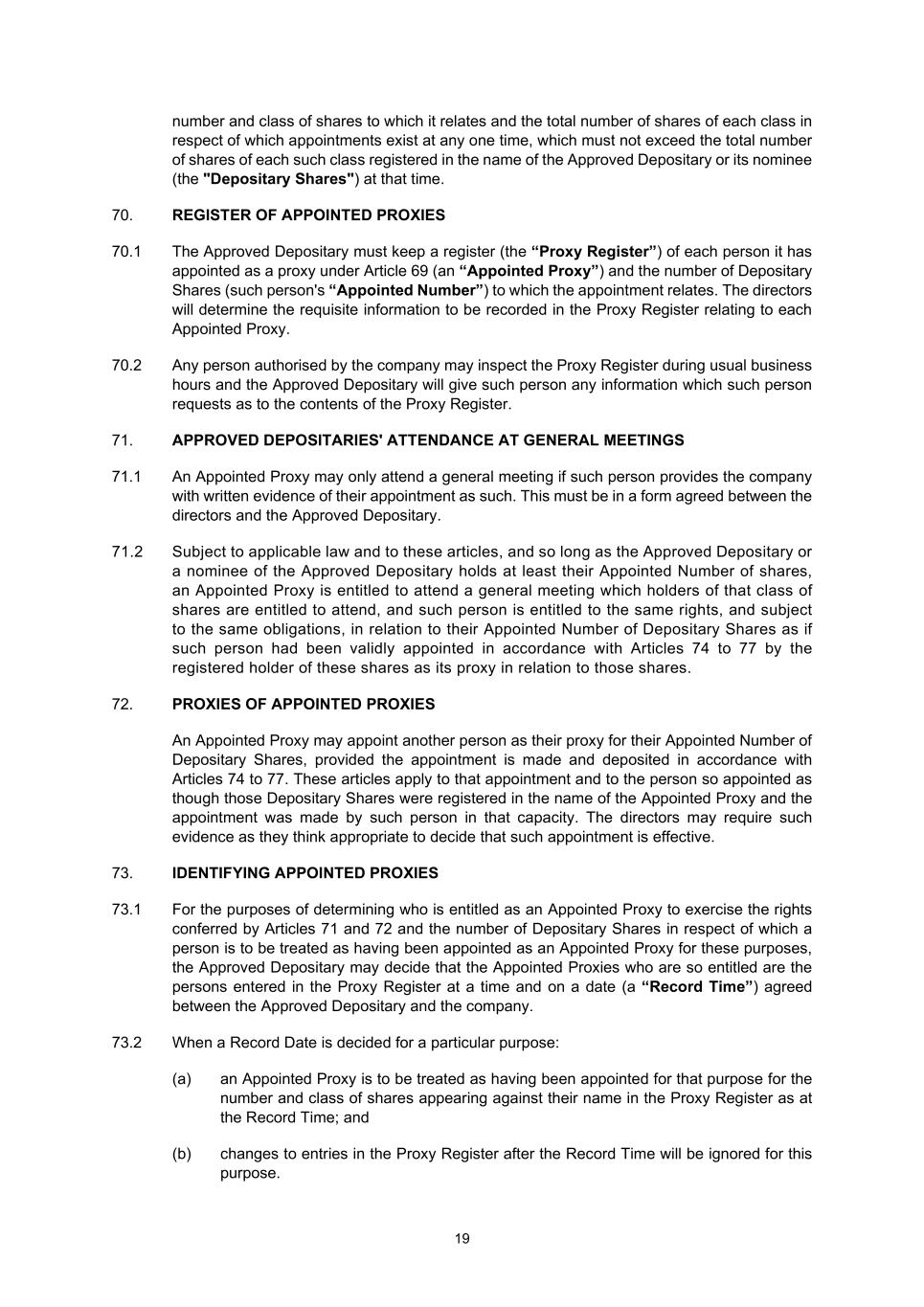 19 number and class of shares to which it relates and the total number of shares of each class in respect of which appointments exist at any one time, which must not exceed the total number of shares of each such class registered in the name of the Approved Depositary or its nominee (the "Depositary Shares") at that time. 70. REGISTER OF APPOINTED PROXIES 70.1 The Approved Depositary must keep a register (the “Proxy Register”) of each person it has appointed as a proxy under Article 69 (an “Appointed Proxy”) and the number of Depositary Shares (such person's “Appointed Number”) to which the appointment relates. The directors will determine the requisite information to be recorded in the Proxy Register relating to each Appointed Proxy. 70.2 Any person authorised by the company may inspect the Proxy Register during usual business hours and the Approved Depositary will give such person any information which such person requests as to the contents of the Proxy Register. 71. APPROVED DEPOSITARIES' ATTENDANCE AT GENERAL MEETINGS 71.1 An Appointed Proxy may only attend a general meeting if such person provides the company with written evidence of their appointment as such. This must be in a form agreed between the directors and the Approved Depositary. 71.2 Subject to applicable law and to these articles, and so long as the Approved Depositary or a nominee of the Approved Depositary holds at least their Appointed Number of shares, an Appointed Proxy is entitled to attend a general meeting which holders of that class of shares are entitled to attend, and such person is entitled to the same rights, and subject to the same obligations, in relation to their Appointed Number of Depositary Shares as if such person had been validly appointed in accordance with Articles 74 to 77 by the registered holder of these shares as its proxy in relation to those shares. 72. PROXIES OF APPOINTED PROXIES An Appointed Proxy may appoint another person as their proxy for their Appointed Number of Depositary Shares, provided the appointment is made and deposited in accordance with Articles 74 to 77. These articles apply to that appointment and to the person so appointed as though those Depositary Shares were registered in the name of the Appointed Proxy and the appointment was made by such person in that capacity. The directors may require such evidence as they think appropriate to decide that such appointment is effective. 73. IDENTIFYING APPOINTED PROXIES 73.1 For the purposes of determining who is entitled as an Appointed Proxy to exercise the rights conferred by Articles 71 and 72 and the number of Depositary Shares in respect of which a person is to be treated as having been appointed as an Appointed Proxy for these purposes, the Approved Depositary may decide that the Appointed Proxies who are so entitled are the persons entered in the Proxy Register at a time and on a date (a “Record Time”) agreed between the Approved Depositary and the company. 73.2 When a Record Date is decided for a particular purpose: (a) an Appointed Proxy is to be treated as having been appointed for that purpose for the number and class of shares appearing against their name in the Proxy Register as at the Record Time; and (b) changes to entries in the Proxy Register after the Record Time will be ignored for this purpose.