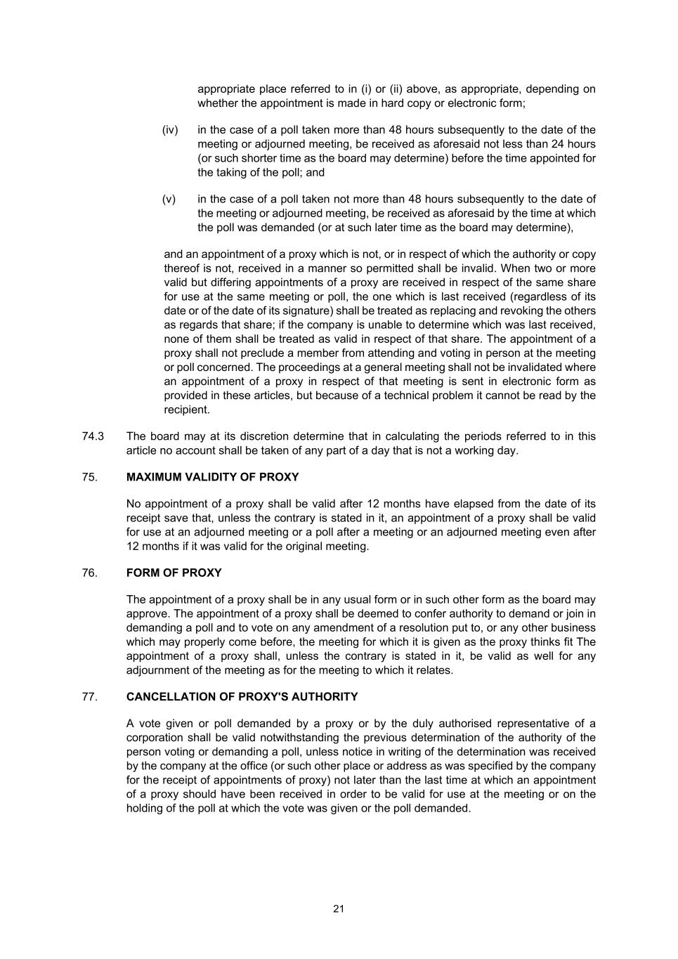21 appropriate place referred to in (i) or (ii) above, as appropriate, depending on whether the appointment is made in hard copy or electronic form; (iv) in the case of a poll taken more than 48 hours subsequently to the date of the meeting or adjourned meeting, be received as aforesaid not less than 24 hours (or such shorter time as the board may determine) before the time appointed for the taking of the poll; and (v) in the case of a poll taken not more than 48 hours subsequently to the date of the meeting or adjourned meeting, be received as aforesaid by the time at which the poll was demanded (or at such later time as the board may determine), and an appointment of a proxy which is not, or in respect of which the authority or copy thereof is not, received in a manner so permitted shall be invalid. When two or more valid but differing appointments of a proxy are received in respect of the same share for use at the same meeting or poll, the one which is last received (regardless of its date or of the date of its signature) shall be treated as replacing and revoking the others as regards that share; if the company is unable to determine which was last received, none of them shall be treated as valid in respect of that share. The appointment of a proxy shall not preclude a member from attending and voting in person at the meeting or poll concerned. The proceedings at a general meeting shall not be invalidated where an appointment of a proxy in respect of that meeting is sent in electronic form as provided in these articles, but because of a technical problem it cannot be read by the recipient. 74.3 The board may at its discretion determine that in calculating the periods referred to in this article no account shall be taken of any part of a day that is not a working day. 75. MAXIMUM VALIDITY OF PROXY No appointment of a proxy shall be valid after 12 months have elapsed from the date of its receipt save that, unless the contrary is stated in it, an appointment of a proxy shall be valid for use at an adjourned meeting or a poll after a meeting or an adjourned meeting even after 12 months if it was valid for the original meeting. 76. FORM OF PROXY The appointment of a proxy shall be in any usual form or in such other form as the board may approve. The appointment of a proxy shall be deemed to confer authority to demand or join in demanding a poll and to vote on any amendment of a resolution put to, or any other business which may properly come before, the meeting for which it is given as the proxy thinks fit The appointment of a proxy shall, unless the contrary is stated in it, be valid as well for any adjournment of the meeting as for the meeting to which it relates. 77. CANCELLATION OF PROXY'S AUTHORITY A vote given or poll demanded by a proxy or by the duly authorised representative of a corporation shall be valid notwithstanding the previous determination of the authority of the person voting or demanding a poll, unless notice in writing of the determination was received by the company at the office (or such other place or address as was specified by the company for the receipt of appointments of proxy) not later than the last time at which an appointment of a proxy should have been received in order to be valid for use at the meeting or on the holding of the poll at which the vote was given or the poll demanded.