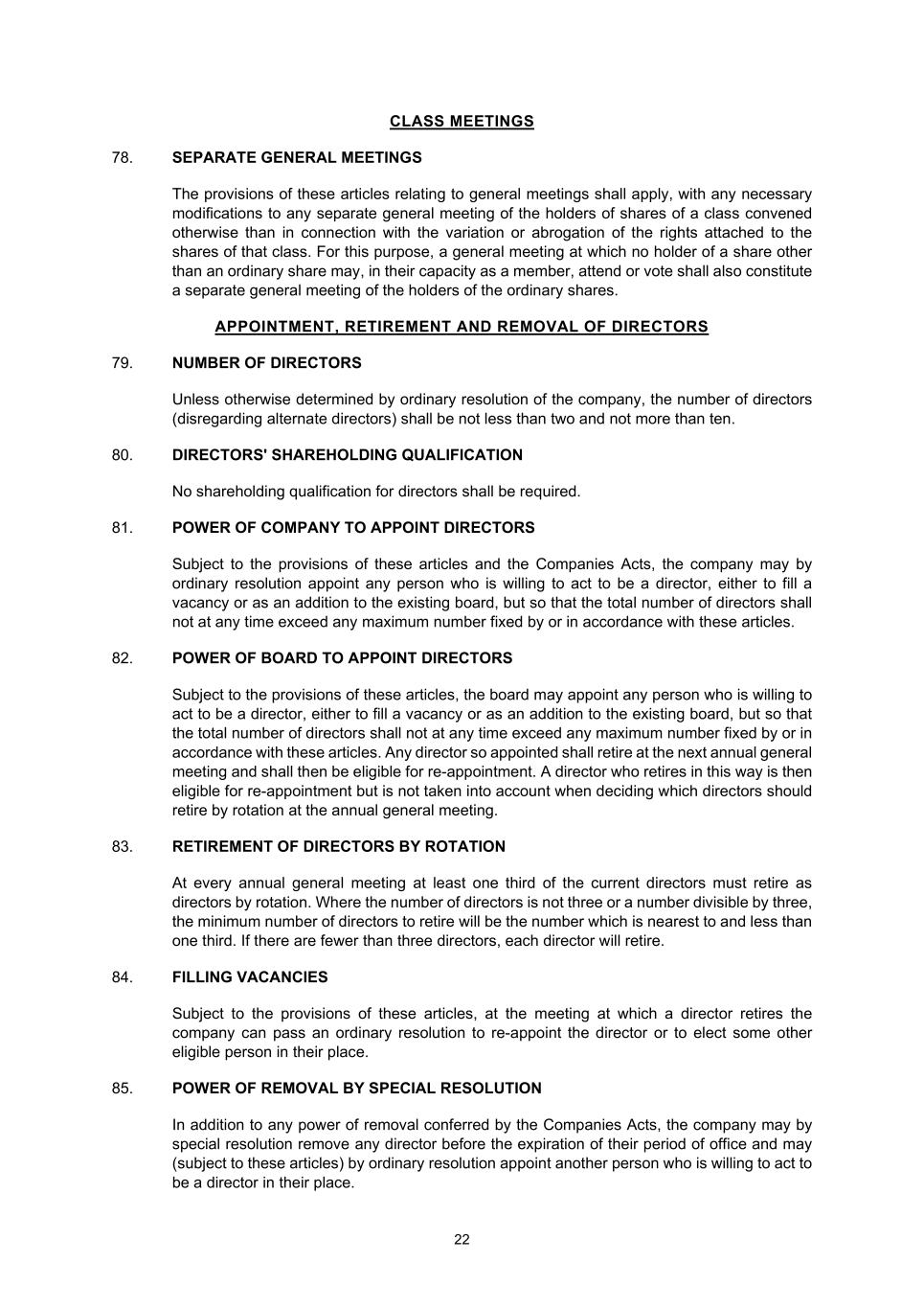 22 CLASS MEETINGS 78. SEPARATE GENERAL MEETINGS The provisions of these articles relating to general meetings shall apply, with any necessary modifications to any separate general meeting of the holders of shares of a class convened otherwise than in connection with the variation or abrogation of the rights attached to the shares of that class. For this purpose, a general meeting at which no holder of a share other than an ordinary share may, in their capacity as a member, attend or vote shall also constitute a separate general meeting of the holders of the ordinary shares. APPOINTMENT, RETIREMENT AND REMOVAL OF DIRECTORS 79. NUMBER OF DIRECTORS Unless otherwise determined by ordinary resolution of the company, the number of directors (disregarding alternate directors) shall be not less than two and not more than ten. 80. DIRECTORS' SHAREHOLDING QUALIFICATION No shareholding qualification for directors shall be required. 81. POWER OF COMPANY TO APPOINT DIRECTORS Subject to the provisions of these articles and the Companies Acts, the company may by ordinary resolution appoint any person who is willing to act to be a director, either to fill a vacancy or as an addition to the existing board, but so that the total number of directors shall not at any time exceed any maximum number fixed by or in accordance with these articles. 82. POWER OF BOARD TO APPOINT DIRECTORS Subject to the provisions of these articles, the board may appoint any person who is willing to act to be a director, either to fill a vacancy or as an addition to the existing board, but so that the total number of directors shall not at any time exceed any maximum number fixed by or in accordance with these articles. Any director so appointed shall retire at the next annual general meeting and shall then be eligible for re-appointment. A director who retires in this way is then eligible for re-appointment but is not taken into account when deciding which directors should retire by rotation at the annual general meeting. 83. RETIREMENT OF DIRECTORS BY ROTATION At every annual general meeting at least one third of the current directors must retire as directors by rotation. Where the number of directors is not three or a number divisible by three, the minimum number of directors to retire will be the number which is nearest to and less than one third. If there are fewer than three directors, each director will retire. 84. FILLING VACANCIES Subject to the provisions of these articles, at the meeting at which a director retires the company can pass an ordinary resolution to re-appoint the director or to elect some other eligible person in their place. 85. POWER OF REMOVAL BY SPECIAL RESOLUTION In addition to any power of removal conferred by the Companies Acts, the company may by special resolution remove any director before the expiration of their period of office and may (subject to these articles) by ordinary resolution appoint another person who is willing to act to be a director in their place.