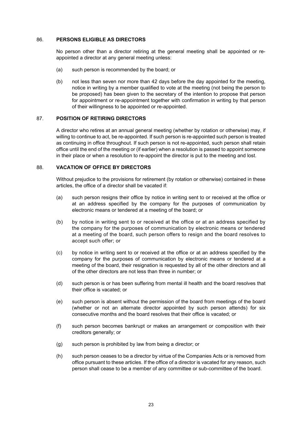 23 86. PERSONS ELIGIBLE AS DIRECTORS No person other than a director retiring at the general meeting shall be appointed or re- appointed a director at any general meeting unless: (a) such person is recommended by the board; or (b) not less than seven nor more than 42 days before the day appointed for the meeting, notice in writing by a member qualified to vote at the meeting (not being the person to be proposed) has been given to the secretary of the intention to propose that person for appointment or re-appointment together with confirmation in writing by that person of their willingness to be appointed or re-appointed. 87. POSITION OF RETIRING DIRECTORS A director who retires at an annual general meeting (whether by rotation or otherwise) may, if willing to continue to act, be re-appointed. If such person is re-appointed such person is treated as continuing in office throughout. If such person is not re-appointed, such person shall retain office until the end of the meeting or (if earlier) when a resolution is passed to appoint someone in their place or when a resolution to re-appoint the director is put to the meeting and lost. 88. VACATION OF OFFICE BY DIRECTORS Without prejudice to the provisions for retirement (by rotation or otherwise) contained in these articles, the office of a director shall be vacated if: (a) such person resigns their office by notice in writing sent to or received at the office or at an address specified by the company for the purposes of communication by electronic means or tendered at a meeting of the board; or (b) by notice in writing sent to or received at the office or at an address specified by the company for the purposes of communication by electronic means or tendered at a meeting of the board, such person offers to resign and the board resolves to accept such offer; or (c) by notice in writing sent to or received at the office or at an address specified by the company for the purposes of communication by electronic means or tendered at a meeting of the board, their resignation is requested by all of the other directors and all of the other directors are not less than three in number; or (d) such person is or has been suffering from mental ill health and the board resolves that their office is vacated; or (e) such person is absent without the permission of the board from meetings of the board (whether or not an alternate director appointed by such person attends) for six consecutive months and the board resolves that their office is vacated; or (f) such person becomes bankrupt or makes an arrangement or composition with their creditors generally; or (g) such person is prohibited by law from being a director; or (h) such person ceases to be a director by virtue of the Companies Acts or is removed from office pursuant to these articles. If the office of a director is vacated for any reason, such person shall cease to be a member of any committee or sub-committee of the board.