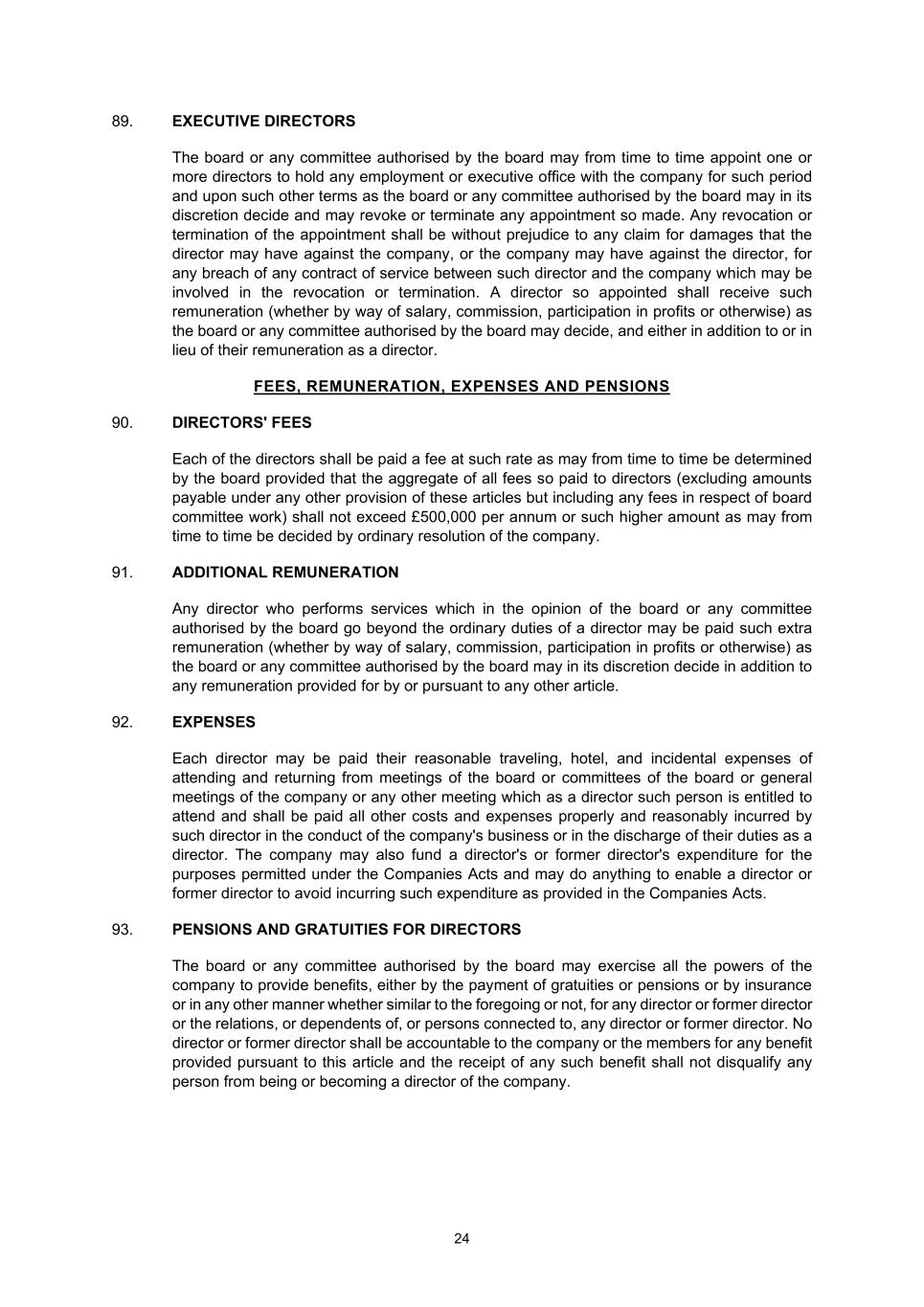 24 89. EXECUTIVE DIRECTORS The board or any committee authorised by the board may from time to time appoint one or more directors to hold any employment or executive office with the company for such period and upon such other terms as the board or any committee authorised by the board may in its discretion decide and may revoke or terminate any appointment so made. Any revocation or termination of the appointment shall be without prejudice to any claim for damages that the director may have against the company, or the company may have against the director, for any breach of any contract of service between such director and the company which may be involved in the revocation or termination. A director so appointed shall receive such remuneration (whether by way of salary, commission, participation in profits or otherwise) as the board or any committee authorised by the board may decide, and either in addition to or in lieu of their remuneration as a director. FEES, REMUNERATION, EXPENSES AND PENSIONS 90. DIRECTORS' FEES Each of the directors shall be paid a fee at such rate as may from time to time be determined by the board provided that the aggregate of all fees so paid to directors (excluding amounts payable under any other provision of these articles but including any fees in respect of board committee work) shall not exceed £500,000 per annum or such higher amount as may from time to time be decided by ordinary resolution of the company. 91. ADDITIONAL REMUNERATION Any director who performs services which in the opinion of the board or any committee authorised by the board go beyond the ordinary duties of a director may be paid such extra remuneration (whether by way of salary, commission, participation in profits or otherwise) as the board or any committee authorised by the board may in its discretion decide in addition to any remuneration provided for by or pursuant to any other article. 92. EXPENSES Each director may be paid their reasonable traveling, hotel, and incidental expenses of attending and returning from meetings of the board or committees of the board or general meetings of the company or any other meeting which as a director such person is entitled to attend and shall be paid all other costs and expenses properly and reasonably incurred by such director in the conduct of the company's business or in the discharge of their duties as a director. The company may also fund a director's or former director's expenditure for the purposes permitted under the Companies Acts and may do anything to enable a director or former director to avoid incurring such expenditure as provided in the Companies Acts. 93. PENSIONS AND GRATUITIES FOR DIRECTORS The board or any committee authorised by the board may exercise all the powers of the company to provide benefits, either by the payment of gratuities or pensions or by insurance or in any other manner whether similar to the foregoing or not, for any director or former director or the relations, or dependents of, or persons connected to, any director or former director. No director or former director shall be accountable to the company or the members for any benefit provided pursuant to this article and the receipt of any such benefit shall not disqualify any person from being or becoming a director of the company.