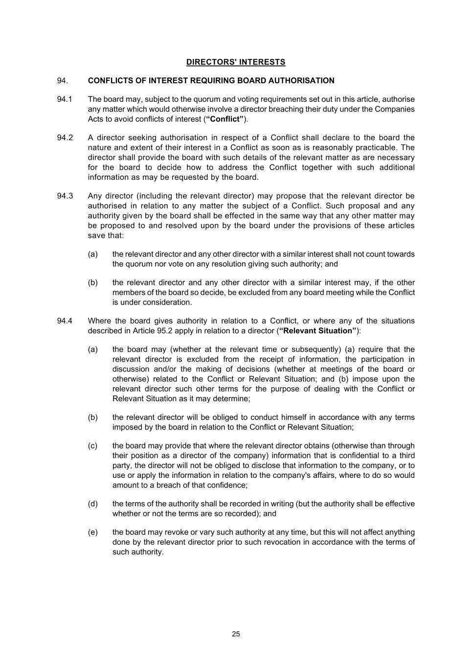 25 DIRECTORS' INTERESTS 94. CONFLICTS OF INTEREST REQUIRING BOARD AUTHORISATION 94.1 The board may, subject to the quorum and voting requirements set out in this article, authorise any matter which would otherwise involve a director breaching their duty under the Companies Acts to avoid conflicts of interest (“Conflict”). 94.2 A director seeking authorisation in respect of a Conflict shall declare to the board the nature and extent of their interest in a Conflict as soon as is reasonably practicable. The director shall provide the board with such details of the relevant matter as are necessary for the board to decide how to address the Conflict together with such additional information as may be requested by the board. 94.3 Any director (including the relevant director) may propose that the relevant director be authorised in relation to any matter the subject of a Conflict. Such proposal and any authority given by the board shall be effected in the same way that any other matter may be proposed to and resolved upon by the board under the provisions of these articles save that: (a) the relevant director and any other director with a similar interest shall not count towards the quorum nor vote on any resolution giving such authority; and (b) the relevant director and any other director with a similar interest may, if the other members of the board so decide, be excluded from any board meeting while the Conflict is under consideration. 94.4 Where the board gives authority in relation to a Conflict, or where any of the situations described in Article 95.2 apply in relation to a director (“Relevant Situation”): (a) the board may (whether at the relevant time or subsequently) (a) require that the relevant director is excluded from the receipt of information, the participation in discussion and/or the making of decisions (whether at meetings of the board or otherwise) related to the Conflict or Relevant Situation; and (b) impose upon the relevant director such other terms for the purpose of dealing with the Conflict or Relevant Situation as it may determine; (b) the relevant director will be obliged to conduct himself in accordance with any terms imposed by the board in relation to the Conflict or Relevant Situation; (c) the board may provide that where the relevant director obtains (otherwise than through their position as a director of the company) information that is confidential to a third party, the director will not be obliged to disclose that information to the company, or to use or apply the information in relation to the company's affairs, where to do so would amount to a breach of that confidence; (d) the terms of the authority shall be recorded in writing (but the authority shall be effective whether or not the terms are so recorded); and (e) the board may revoke or vary such authority at any time, but this will not affect anything done by the relevant director prior to such revocation in accordance with the terms of such authority.