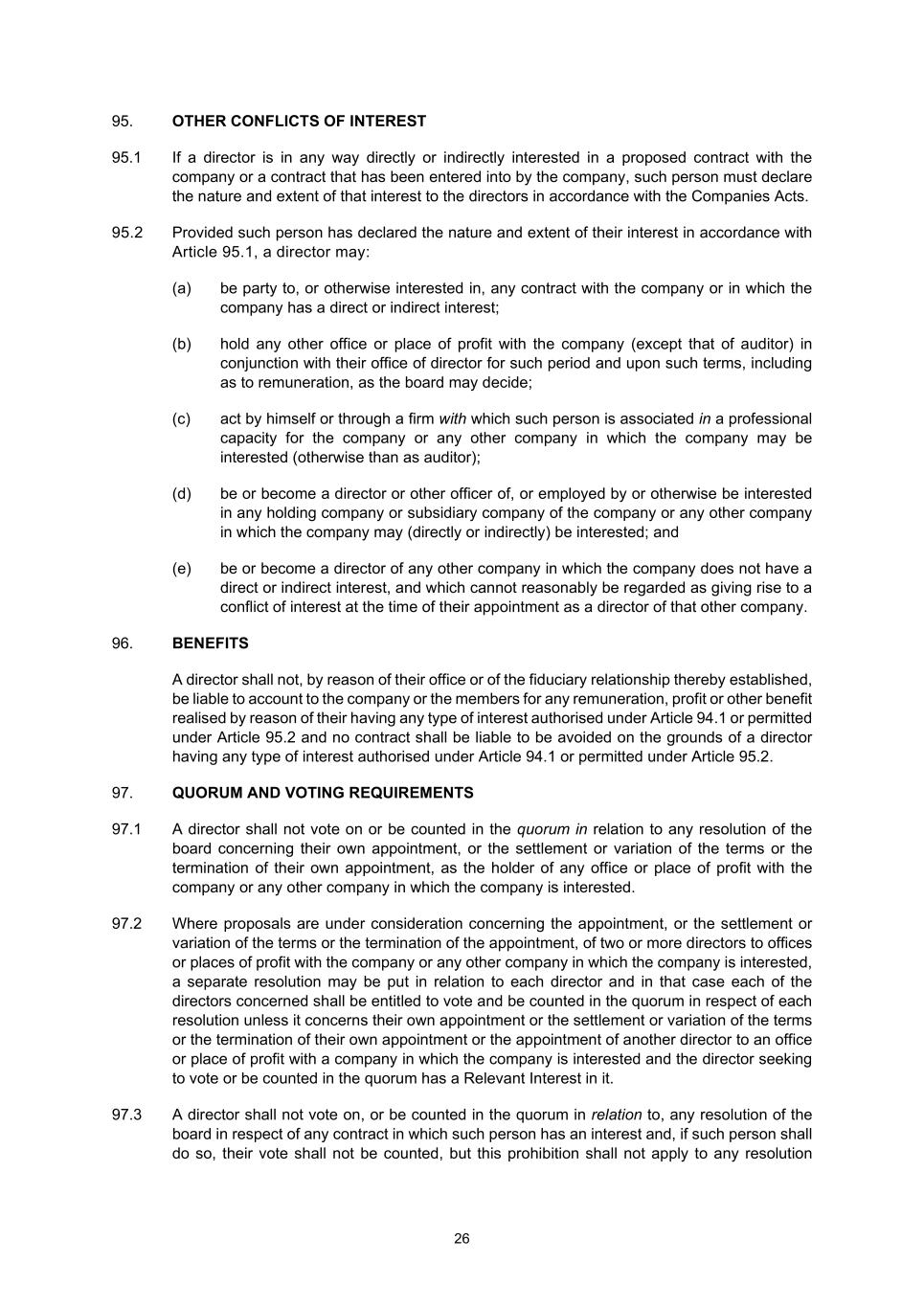26 95. OTHER CONFLICTS OF INTEREST 95.1 If a director is in any way directly or indirectly interested in a proposed contract with the company or a contract that has been entered into by the company, such person must declare the nature and extent of that interest to the directors in accordance with the Companies Acts. 95.2 Provided such person has declared the nature and extent of their interest in accordance with Article 95.1, a director may: (a) be party to, or otherwise interested in, any contract with the company or in which the company has a direct or indirect interest; (b) hold any other office or place of profit with the company (except that of auditor) in conjunction with their office of director for such period and upon such terms, including as to remuneration, as the board may decide; (c) act by himself or through a firm with which such person is associated in a professional capacity for the company or any other company in which the company may be interested (otherwise than as auditor); (d) be or become a director or other officer of, or employed by or otherwise be interested in any holding company or subsidiary company of the company or any other company in which the company may (directly or indirectly) be interested; and (e) be or become a director of any other company in which the company does not have a direct or indirect interest, and which cannot reasonably be regarded as giving rise to a conflict of interest at the time of their appointment as a director of that other company. 96. BENEFITS A director shall not, by reason of their office or of the fiduciary relationship thereby established, be liable to account to the company or the members for any remuneration, profit or other benefit realised by reason of their having any type of interest authorised under Article 94.1 or permitted under Article 95.2 and no contract shall be liable to be avoided on the grounds of a director having any type of interest authorised under Article 94.1 or permitted under Article 95.2. 97. QUORUM AND VOTING REQUIREMENTS 97.1 A director shall not vote on or be counted in the quorum in relation to any resolution of the board concerning their own appointment, or the settlement or variation of the terms or the termination of their own appointment, as the holder of any office or place of profit with the company or any other company in which the company is interested. 97.2 Where proposals are under consideration concerning the appointment, or the settlement or variation of the terms or the termination of the appointment, of two or more directors to offices or places of profit with the company or any other company in which the company is interested, a separate resolution may be put in relation to each director and in that case each of the directors concerned shall be entitled to vote and be counted in the quorum in respect of each resolution unless it concerns their own appointment or the settlement or variation of the terms or the termination of their own appointment or the appointment of another director to an office or place of profit with a company in which the company is interested and the director seeking to vote or be counted in the quorum has a Relevant Interest in it. 97.3 A director shall not vote on, or be counted in the quorum in relation to, any resolution of the board in respect of any contract in which such person has an interest and, if such person shall do so, their vote shall not be counted, but this prohibition shall not apply to any resolution
