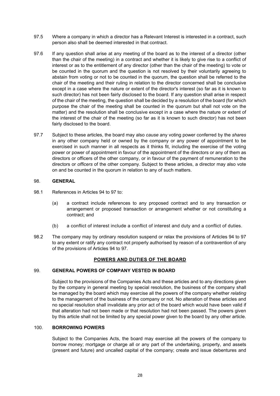 28 97.5 Where a company in which a director has a Relevant Interest is interested in a contract, such person also shall be deemed interested in that contract. 97.6 If any question shall arise at any meeting of the board as to the interest of a director (other than the chair of the meeting) in a contract and whether it is likely to give rise to a conflict of interest or as to the entitlement of any director (other than the chair of the meeting) to vote or be counted in the quorum and the question is not resolved by their voluntarily agreeing to abstain from voting or not to be counted in the quorum, the question shall be referred to the chair of the meeting and their ruling in relation to the director concerned shall be conclusive except in a case where the nature or extent of the director's interest (so far as it is known to such director) has not been fairly disclosed to the board. If any question shall arise in respect of the chair of the meeting, the question shall be decided by a resolution of the board (for which purpose the chair of the meeting shall be counted in the quorum but shall not vote on the matter) and the resolution shall be conclusive except in a case where the nature or extent of the interest of the chair of the meeting (so far as it is known to such director) has not been fairly disclosed to the board. 97.7 Subject to these articles, the board may also cause any voting power conferred by the shares in any other company held or owned by the company or any power of appointment to be exercised in such manner in all respects as it thinks fit, including the exercise of the voting power or power of appointment in favour of the appointment of the directors or any of them as directors or officers of the other company, or in favour of the payment of remuneration to the directors or officers of the other company. Subject to these articles, a director may also vote on and be counted in the quorum in relation to any of such matters. 98. GENERAL 98.1 References in Articles 94 to 97 to: (a) a contract include references to any proposed contract and to any transaction or arrangement or proposed transaction or arrangement whether or not constituting a contract; and (b) a conflict of interest include a conflict of interest and duty and a conflict of duties. 98.2 The company may by ordinary resolution suspend or relax the provisions of Articles 94 to 97 to any extent or ratify any contract not properly authorised by reason of a contravention of any of the provisions of Articles 94 to 97. POWERS AND DUTIES OF THE BOARD 99. GENERAL POWERS OF COMPANY VESTED IN BOARD Subject to the provisions of the Companies Acts and these articles and to any directions given by the company in general meeting by special resolution, the business of the company shall be managed by the board which may exercise all the powers of the company whether relating to the management of the business of the company or not. No alteration of these articles and no special resolution shall invalidate any prior act of the board which would have been valid if that alteration had not been made or that resolution had not been passed. The powers given by this article shall not be limited by any special power given to the board by any other article. 100. BORROWING POWERS Subject to the Companies Acts, the board may exercise all the powers of the company to borrow money; mortgage or charge all or any part of the undertaking, property, and assets (present and future) and uncalled capital of the company; create and issue debentures and