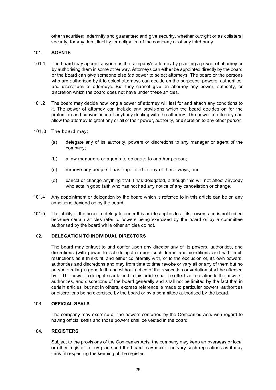 29 other securities; indemnify and guarantee; and give security, whether outright or as collateral security, for any debt, liability, or obligation of the company or of any third party. 101. AGENTS 101.1 The board may appoint anyone as the company's attorney by granting a power of attorney or by authorising them in some other way. Attorneys can either be appointed directly by the board or the board can give someone else the power to select attorneys. The board or the persons who are authorised by it to select attorneys can decide on the purposes, powers, authorities, and discretions of attorneys. But they cannot give an attorney any power, authority, or discretion which the board does not have under these articles. 101.2 The board may decide how long a power of attorney will last for and attach any conditions to it. The power of attorney can include any provisions which the board decides on for the protection and convenience of anybody dealing with the attorney. The power of attorney can allow the attorney to grant any or all of their power, authority, or discretion to any other person. 101.3 The board may: (a) delegate any of its authority, powers or discretions to any manager or agent of the company; (b) allow managers or agents to delegate to another person; (c) remove any people it has appointed in any of these ways; and (d) cancel or change anything that it has delegated, although this will not affect anybody who acts in good faith who has not had any notice of any cancellation or change. 101.4 Any appointment or delegation by the board which is referred to in this article can be on any conditions decided on by the board. 101.5 The ability of the board to delegate under this article applies to all its powers and is not limited because certain articles refer to powers being exercised by the board or by a committee authorised by the board while other articles do not. 102. DELEGATION TO INDIVIDUAL DIRECTORS The board may entrust to and confer upon any director any of its powers, authorities, and discretions (with power to sub-delegate) upon such terms and conditions and with such restrictions as it thinks fit, and either collaterally with, or to the exclusion of, its own powers, authorities and discretions and may from time to time revoke or vary all or any of them but no person dealing in good faith and without notice of the revocation or variation shall be affected by it. The power to delegate contained in this article shall be effective in relation to the powers, authorities, and discretions of the board generally and shall not be limited by the fact that in certain articles, but not in others, express reference is made to particular powers, authorities or discretions being exercised by the board or by a committee authorised by the board. 103. OFFICIAL SEALS The company may exercise all the powers conferred by the Companies Acts with regard to having official seals and those powers shall be vested in the board. 104. REGISTERS Subject to the provisions of the Companies Acts, the company may keep an overseas or local or other register in any place and the board may make and vary such regulations as it may think fit respecting the keeping of the register.