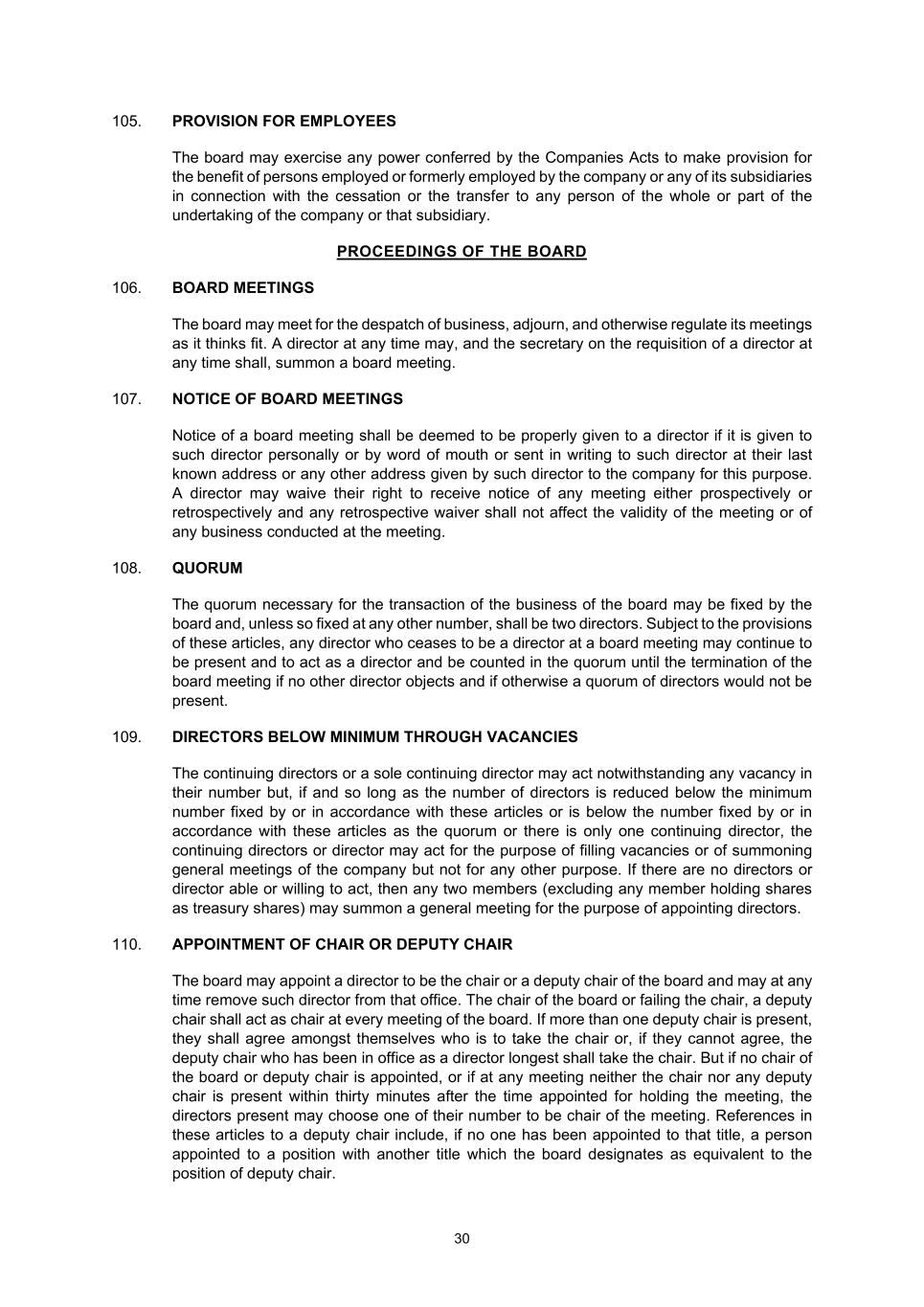 30 105. PROVISION FOR EMPLOYEES The board may exercise any power conferred by the Companies Acts to make provision for the benefit of persons employed or formerly employed by the company or any of its subsidiaries in connection with the cessation or the transfer to any person of the whole or part of the undertaking of the company or that subsidiary. PROCEEDINGS OF THE BOARD 106. BOARD MEETINGS The board may meet for the despatch of business, adjourn, and otherwise regulate its meetings as it thinks fit. A director at any time may, and the secretary on the requisition of a director at any time shall, summon a board meeting. 107. NOTICE OF BOARD MEETINGS Notice of a board meeting shall be deemed to be properly given to a director if it is given to such director personally or by word of mouth or sent in writing to such director at their last known address or any other address given by such director to the company for this purpose. A director may waive their right to receive notice of any meeting either prospectively or retrospectively and any retrospective waiver shall not affect the validity of the meeting or of any business conducted at the meeting. 108. QUORUM The quorum necessary for the transaction of the business of the board may be fixed by the board and, unless so fixed at any other number, shall be two directors. Subject to the provisions of these articles, any director who ceases to be a director at a board meeting may continue to be present and to act as a director and be counted in the quorum until the termination of the board meeting if no other director objects and if otherwise a quorum of directors would not be present. 109. DIRECTORS BELOW MINIMUM THROUGH VACANCIES The continuing directors or a sole continuing director may act notwithstanding any vacancy in their number but, if and so long as the number of directors is reduced below the minimum number fixed by or in accordance with these articles or is below the number fixed by or in accordance with these articles as the quorum or there is only one continuing director, the continuing directors or director may act for the purpose of filling vacancies or of summoning general meetings of the company but not for any other purpose. If there are no directors or director able or willing to act, then any two members (excluding any member holding shares as treasury shares) may summon a general meeting for the purpose of appointing directors. 110. APPOINTMENT OF CHAIR OR DEPUTY CHAIR The board may appoint a director to be the chair or a deputy chair of the board and may at any time remove such director from that office. The chair of the board or failing the chair, a deputy chair shall act as chair at every meeting of the board. If more than one deputy chair is present, they shall agree amongst themselves who is to take the chair or, if they cannot agree, the deputy chair who has been in office as a director longest shall take the chair. But if no chair of the board or deputy chair is appointed, or if at any meeting neither the chair nor any deputy chair is present within thirty minutes after the time appointed for holding the meeting, the directors present may choose one of their number to be chair of the meeting. References in these articles to a deputy chair include, if no one has been appointed to that title, a person appointed to a position with another title which the board designates as equivalent to the position of deputy chair.