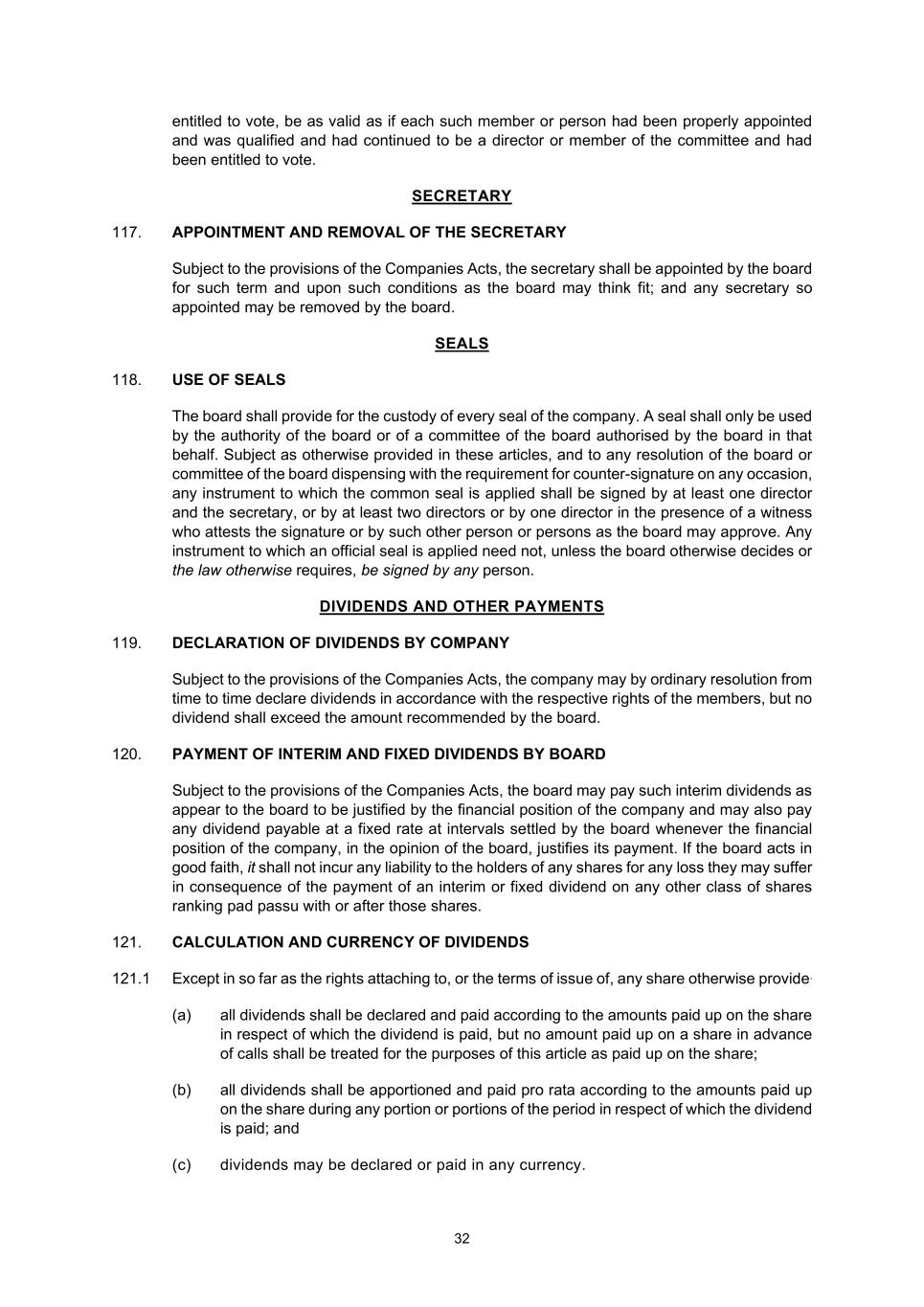 32 entitled to vote, be as valid as if each such member or person had been properly appointed and was qualified and had continued to be a director or member of the committee and had been entitled to vote. SECRETARY 117. APPOINTMENT AND REMOVAL OF THE SECRETARY Subject to the provisions of the Companies Acts, the secretary shall be appointed by the board for such term and upon such conditions as the board may think fit; and any secretary so appointed may be removed by the board. SEALS 118. USE OF SEALS The board shall provide for the custody of every seal of the company. A seal shall only be used by the authority of the board or of a committee of the board authorised by the board in that behalf. Subject as otherwise provided in these articles, and to any resolution of the board or committee of the board dispensing with the requirement for counter-signature on any occasion, any instrument to which the common seal is applied shall be signed by at least one director and the secretary, or by at least two directors or by one director in the presence of a witness who attests the signature or by such other person or persons as the board may approve. Any instrument to which an official seal is applied need not, unless the board otherwise decides or the law otherwise requires, be signed by any person. DIVIDENDS AND OTHER PAYMENTS 119. DECLARATION OF DIVIDENDS BY COMPANY Subject to the provisions of the Companies Acts, the company may by ordinary resolution from time to time declare dividends in accordance with the respective rights of the members, but no dividend shall exceed the amount recommended by the board. 120. PAYMENT OF INTERIM AND FIXED DIVIDENDS BY BOARD Subject to the provisions of the Companies Acts, the board may pay such interim dividends as appear to the board to be justified by the financial position of the company and may also pay any dividend payable at a fixed rate at intervals settled by the board whenever the financial position of the company, in the opinion of the board, justifies its payment. If the board acts in good faith, it shall not incur any liability to the holders of any shares for any loss they may suffer in consequence of the payment of an interim or fixed dividend on any other class of shares ranking pad passu with or after those shares. 121. CALCULATION AND CURRENCY OF DIVIDENDS 121.1 Except in so far as the rights attaching to, or the terms of issue of, any share otherwise provide. (a) all dividends shall be declared and paid according to the amounts paid up on the share in respect of which the dividend is paid, but no amount paid up on a share in advance of calls shall be treated for the purposes of this article as paid up on the share; (b) all dividends shall be apportioned and paid pro rata according to the amounts paid up on the share during any portion or portions of the period in respect of which the dividend is paid; and (c) dividends may be declared or paid in any currency.