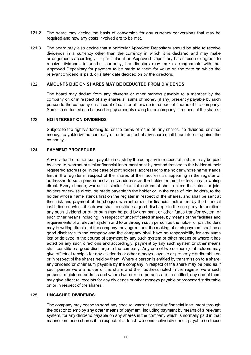 33 121.2 The board may decide the basis of conversion for any currency conversions that may be required and how any costs involved are to be met. 121.3 The board may also decide that a particular Approved Depositary should be able to receive dividends in a currency other than the currency in which it is declared and may make arrangements accordingly. In particular, if an Approved Depositary has chosen or agreed to receive dividends in another currency, the directors may make arrangements with that Approved Depositary for payment to be made to them for value on the date on which the relevant dividend is paid, or a later date decided on by the directors. 122. AMOUNTS DUE ON SHARES MAY BE DEDUCTED FROM DIVIDENDS The board may deduct from any dividend or other moneys payable to a member by the company on or in respect of any shares all sums of money (if any) presently payable by such person to the company on account of calls or otherwise in respect of shares of the company. Sums so deducted can be used to pay amounts owing to the company in respect of the shares. 123. NO INTEREST ON DIVIDENDS Subject to the rights attaching to, or the terms of issue of, any shares, no dividend, or other moneys payable by the company on or in respect of any share shall bear interest against the company. 124. PAYMENT PROCEDURE Any dividend or other sum payable in cash by the company in respect of a share may be paid by cheque, warrant or similar financial instrument sent by post addressed to the holder at their registered address or, in the case of joint holders, addressed to the holder whose name stands first in the register in respect of the shares at their address as appearing in the register or addressed to such person and at such address as the holder or joint holders may in writing direct. Every cheque, warrant or similar financial instrument shall, unless the holder or joint holders otherwise direct, be made payable to the holder or, in the case of joint holders, to the holder whose name stands first on the register in respect of the shares, and shall be sent at their risk and payment of the cheque, warrant or similar financial instrument by the financial institution on which it is drawn shall constitute a good discharge to the company. In addition, any such dividend or other sum may be paid by any bank or other funds transfer system or such other means including, in respect of uncertificated shares, by means of the facilities and requirements of a relevant system and to or through such person as the holder or joint holders may in writing direct and the company may agree, and the making of such payment shall be a good discharge to the company and the company shall have no responsibility for any sums lost or delayed in the course of payment by any such system or other means or where it has acted on any such directions and accordingly, payment by any such system or other means shall constitute a good discharge to the company. Any one of two or more joint holders may give effectual receipts for any dividends or other moneys payable or property distributable on or in respect of the shares held by them. Where a person is entitled by transmission to a share, any dividend or other sum payable by the company in respect of the share may be paid as if such person were a holder of the share and their address noted in the register were such person's registered address and where two or more persons are so entitled, any one of them may give effectual receipts for any dividends or other moneys payable or property distributable on or in respect of the shares. 125. UNCASHED DIVIDENDS The company may cease to send any cheque, warrant or similar financial instrument through the post or to employ any other means of payment, including payment by means of a relevant system, for any dividend payable on any shares in the company which is normally paid in that manner on those shares if in respect of at least two consecutive dividends payable on those