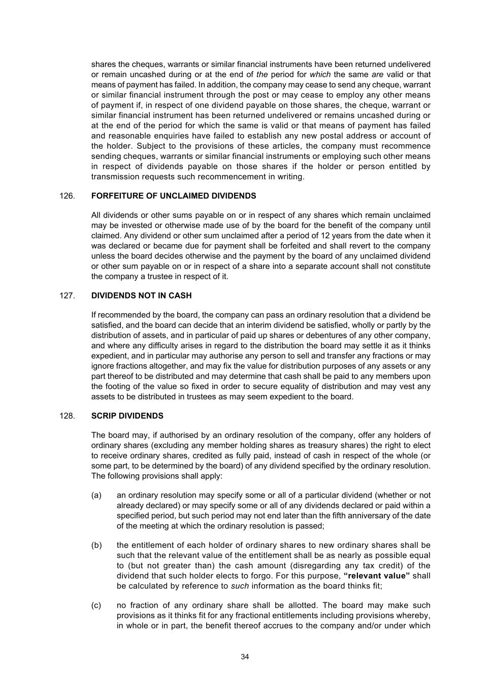 34 shares the cheques, warrants or similar financial instruments have been returned undelivered or remain uncashed during or at the end of the period for which the same are valid or that means of payment has failed. In addition, the company may cease to send any cheque, warrant or similar financial instrument through the post or may cease to employ any other means of payment if, in respect of one dividend payable on those shares, the cheque, warrant or similar financial instrument has been returned undelivered or remains uncashed during or at the end of the period for which the same is valid or that means of payment has failed and reasonable enquiries have failed to establish any new postal address or account of the holder. Subject to the provisions of these articles, the company must recommence sending cheques, warrants or similar financial instruments or employing such other means in respect of dividends payable on those shares if the holder or person entitled by transmission requests such recommencement in writing. 126. FORFEITURE OF UNCLAIMED DIVIDENDS All dividends or other sums payable on or in respect of any shares which remain unclaimed may be invested or otherwise made use of by the board for the benefit of the company until claimed. Any dividend or other sum unclaimed after a period of 12 years from the date when it was declared or became due for payment shall be forfeited and shall revert to the company unless the board decides otherwise and the payment by the board of any unclaimed dividend or other sum payable on or in respect of a share into a separate account shall not constitute the company a trustee in respect of it. 127. DIVIDENDS NOT IN CASH If recommended by the board, the company can pass an ordinary resolution that a dividend be satisfied, and the board can decide that an interim dividend be satisfied, wholly or partly by the distribution of assets, and in particular of paid up shares or debentures of any other company, and where any difficulty arises in regard to the distribution the board may settle it as it thinks expedient, and in particular may authorise any person to sell and transfer any fractions or may ignore fractions altogether, and may fix the value for distribution purposes of any assets or any part thereof to be distributed and may determine that cash shall be paid to any members upon the footing of the value so fixed in order to secure equality of distribution and may vest any assets to be distributed in trustees as may seem expedient to the board. 128. SCRIP DIVIDENDS The board may, if authorised by an ordinary resolution of the company, offer any holders of ordinary shares (excluding any member holding shares as treasury shares) the right to elect to receive ordinary shares, credited as fully paid, instead of cash in respect of the whole (or some part, to be determined by the board) of any dividend specified by the ordinary resolution. The following provisions shall apply: (a) an ordinary resolution may specify some or all of a particular dividend (whether or not already declared) or may specify some or all of any dividends declared or paid within a specified period, but such period may not end later than the fifth anniversary of the date of the meeting at which the ordinary resolution is passed; (b) the entitlement of each holder of ordinary shares to new ordinary shares shall be such that the relevant value of the entitlement shall be as nearly as possible equal to (but not greater than) the cash amount (disregarding any tax credit) of the dividend that such holder elects to forgo. For this purpose, “relevant value” shall be calculated by reference to such information as the board thinks fit; (c) no fraction of any ordinary share shall be allotted. The board may make such provisions as it thinks fit for any fractional entitlements including provisions whereby, in whole or in part, the benefit thereof accrues to the company and/or under which