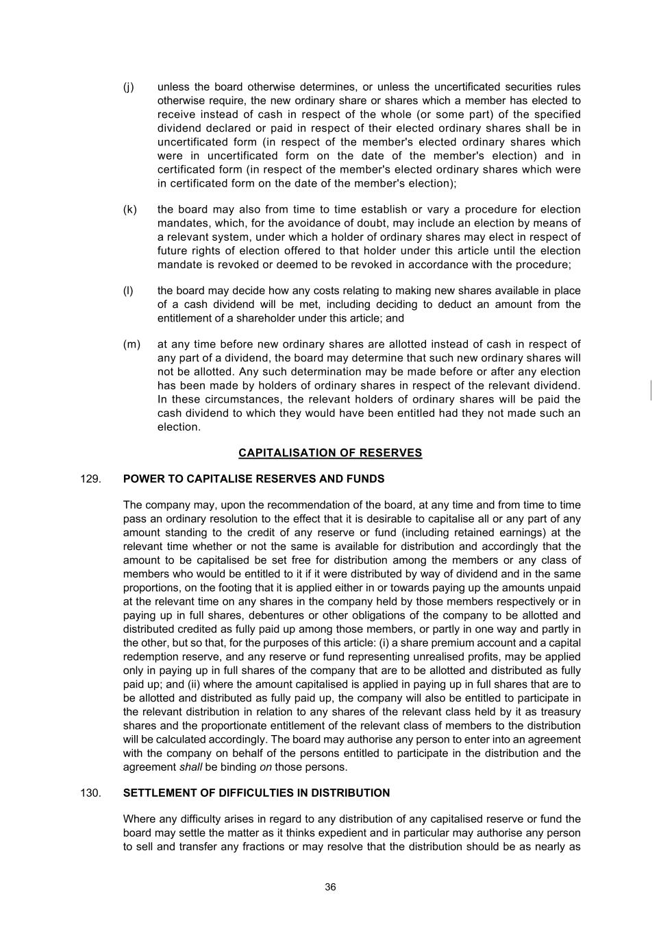 36 (j) unless the board otherwise determines, or unless the uncertificated securities rules otherwise require, the new ordinary share or shares which a member has elected to receive instead of cash in respect of the whole (or some part) of the specified dividend declared or paid in respect of their elected ordinary shares shall be in uncertificated form (in respect of the member's elected ordinary shares which were in uncertificated form on the date of the member's election) and in certificated form (in respect of the member's elected ordinary shares which were in certificated form on the date of the member's election); (k) the board may also from time to time establish or vary a procedure for election mandates, which, for the avoidance of doubt, may include an election by means of a relevant system, under which a holder of ordinary shares may elect in respect of future rights of election offered to that holder under this article until the election mandate is revoked or deemed to be revoked in accordance with the procedure; (l) the board may decide how any costs relating to making new shares available in place of a cash dividend will be met, including deciding to deduct an amount from the entitlement of a shareholder under this article; and (m) at any time before new ordinary shares are allotted instead of cash in respect of any part of a dividend, the board may determine that such new ordinary shares will not be allotted. Any such determination may be made before or after any election has been made by holders of ordinary shares in respect of the relevant dividend. In these circumstances, the relevant holders of ordinary shares will be paid the cash dividend to which they would have been entitled had they not made such an election. CAPITALISATION OF RESERVES 129. POWER TO CAPITALISE RESERVES AND FUNDS The company may, upon the recommendation of the board, at any time and from time to time pass an ordinary resolution to the effect that it is desirable to capitalise all or any part of any amount standing to the credit of any reserve or fund (including retained earnings) at the relevant time whether or not the same is available for distribution and accordingly that the amount to be capitalised be set free for distribution among the members or any class of members who would be entitled to it if it were distributed by way of dividend and in the same proportions, on the footing that it is applied either in or towards paying up the amounts unpaid at the relevant time on any shares in the company held by those members respectively or in paying up in full shares, debentures or other obligations of the company to be allotted and distributed credited as fully paid up among those members, or partly in one way and partly in the other, but so that, for the purposes of this article: (i) a share premium account and a capital redemption reserve, and any reserve or fund representing unrealised profits, may be applied only in paying up in full shares of the company that are to be allotted and distributed as fully paid up; and (ii) where the amount capitalised is applied in paying up in full shares that are to be allotted and distributed as fully paid up, the company will also be entitled to participate in the relevant distribution in relation to any shares of the relevant class held by it as treasury shares and the proportionate entitlement of the relevant class of members to the distribution will be calculated accordingly. The board may authorise any person to enter into an agreement with the company on behalf of the persons entitled to participate in the distribution and the agreement shall be binding on those persons. 130. SETTLEMENT OF DIFFICULTIES IN DISTRIBUTION Where any difficulty arises in regard to any distribution of any capitalised reserve or fund the board may settle the matter as it thinks expedient and in particular may authorise any person to sell and transfer any fractions or may resolve that the distribution should be as nearly as