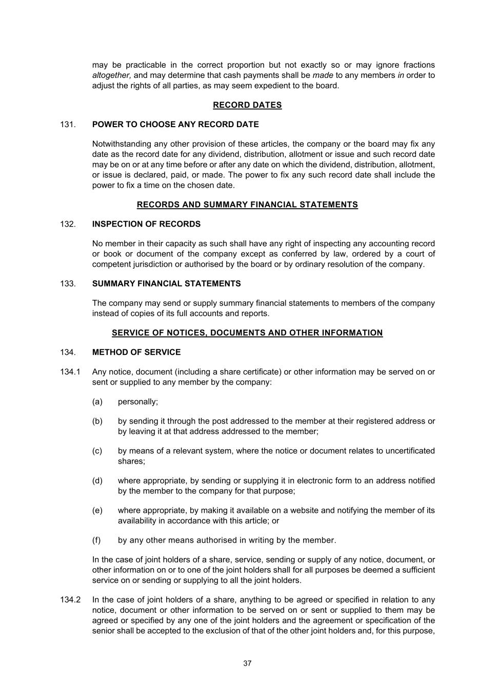 37 may be practicable in the correct proportion but not exactly so or may ignore fractions altogether, and may determine that cash payments shall be made to any members in order to adjust the rights of all parties, as may seem expedient to the board. RECORD DATES 131. POWER TO CHOOSE ANY RECORD DATE Notwithstanding any other provision of these articles, the company or the board may fix any date as the record date for any dividend, distribution, allotment or issue and such record date may be on or at any time before or after any date on which the dividend, distribution, allotment, or issue is declared, paid, or made. The power to fix any such record date shall include the power to fix a time on the chosen date. RECORDS AND SUMMARY FINANCIAL STATEMENTS 132. INSPECTION OF RECORDS No member in their capacity as such shall have any right of inspecting any accounting record or book or document of the company except as conferred by law, ordered by a court of competent jurisdiction or authorised by the board or by ordinary resolution of the company. 133. SUMMARY FINANCIAL STATEMENTS The company may send or supply summary financial statements to members of the company instead of copies of its full accounts and reports. SERVICE OF NOTICES, DOCUMENTS AND OTHER INFORMATION 134. METHOD OF SERVICE 134.1 Any notice, document (including a share certificate) or other information may be served on or sent or supplied to any member by the company: (a) personally; (b) by sending it through the post addressed to the member at their registered address or by leaving it at that address addressed to the member; (c) by means of a relevant system, where the notice or document relates to uncertificated shares; (d) where appropriate, by sending or supplying it in electronic form to an address notified by the member to the company for that purpose; (e) where appropriate, by making it available on a website and notifying the member of its availability in accordance with this article; or (f) by any other means authorised in writing by the member. In the case of joint holders of a share, service, sending or supply of any notice, document, or other information on or to one of the joint holders shall for all purposes be deemed a sufficient service on or sending or supplying to all the joint holders. 134.2 In the case of joint holders of a share, anything to be agreed or specified in relation to any notice, document or other information to be served on or sent or supplied to them may be agreed or specified by any one of the joint holders and the agreement or specification of the senior shall be accepted to the exclusion of that of the other joint holders and, for this purpose,